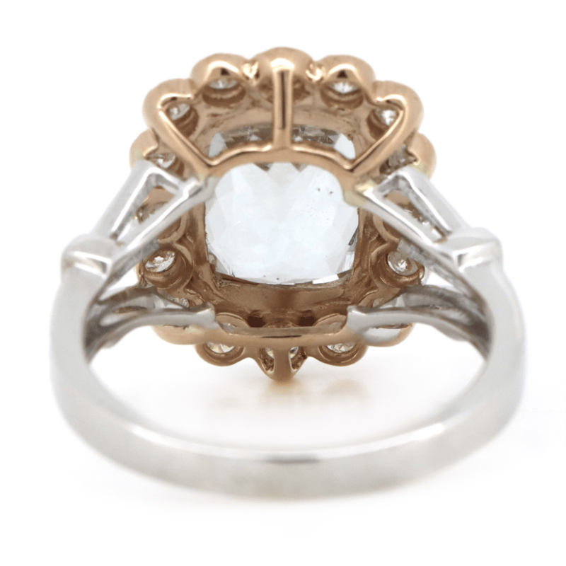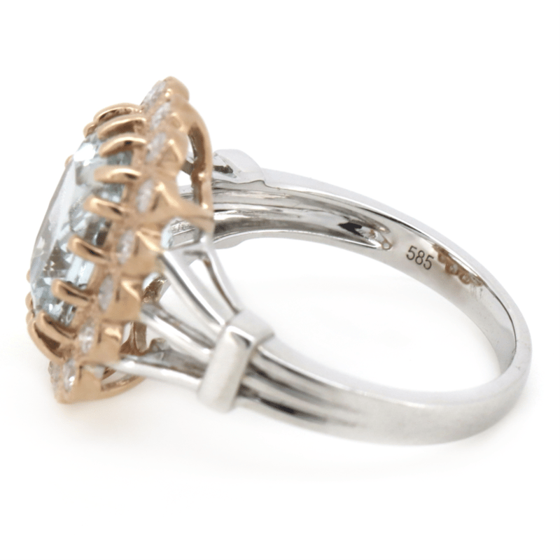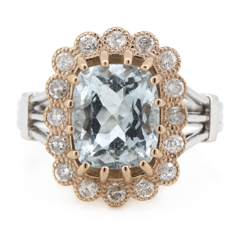 14K WHITE/ROSE GOLD, AQUAMARINE AND DIAMOND, HALO RING. The Centre Features, One Cushion Cut, Light Greyish-Blue, Aquamarine (3.21Ct, Minor Eye Visible Inclusions), Multi-Claw Set In Rose Gold. Encompassing The Design Are, 16 Round Brilliant Cut, Diamonds (0.51Ct Tdw, J-K Colour, Si2-I2 Clarity), Semi-Bezel Set In Rose Gold. Ring Size N. Valuations Provided by an Independent Third-Party Professional Not Directly Associated With Lloyds Auctions at AUD $$8,890.00This valuation has been conducted by an independent third-party professional. The valuation amount is an assessment by the issuing valuer and does not reflect the auction value of the item. Any inquiries regarding the valuation should be directed to the issuing valuer (refer to contact details on the certificate), as Lloyds Auctions has no affiliation or influence over the valuation, the valuer, or the stated amount. Condition: Good - Refer Images 0645888+1400