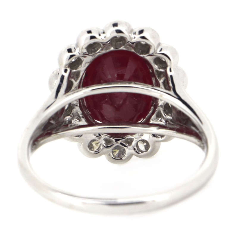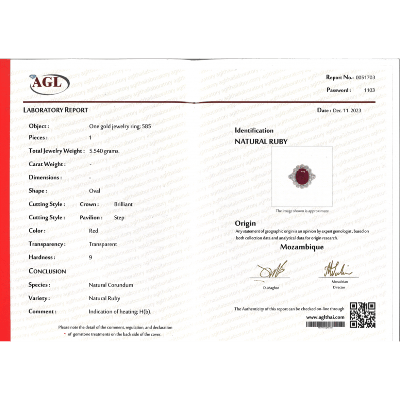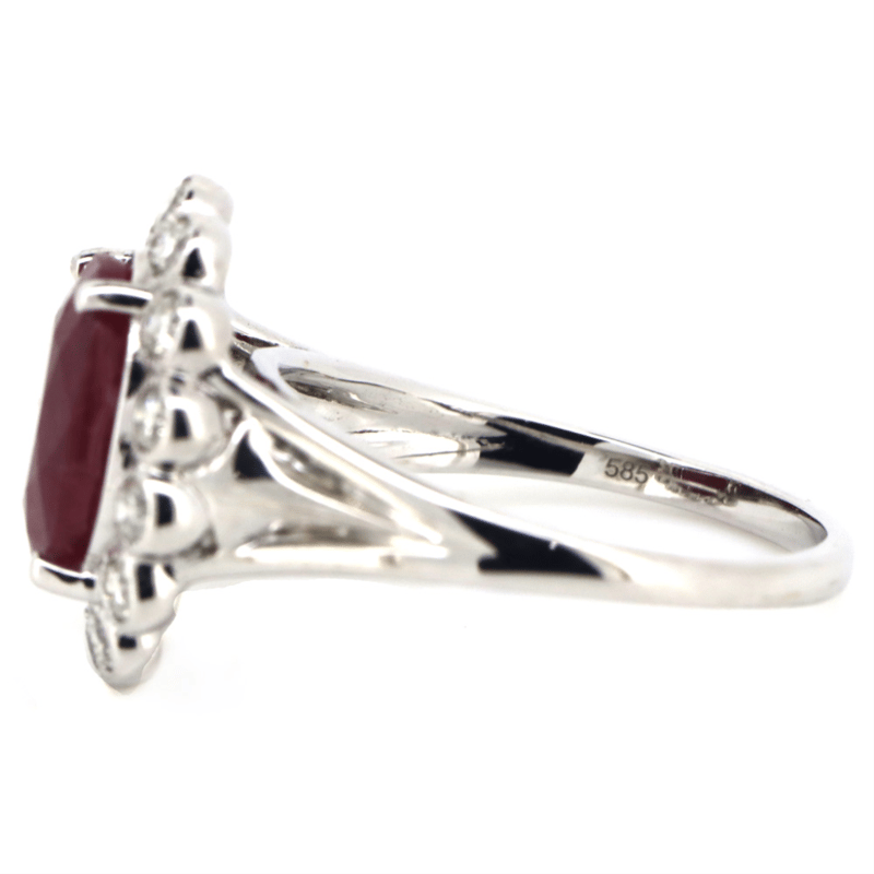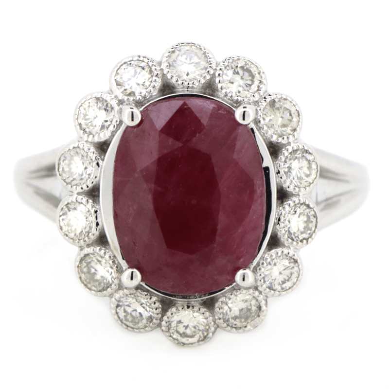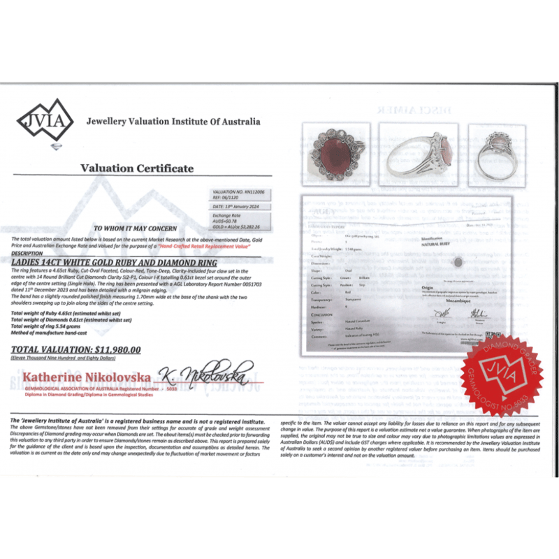 14K WHITE GOLD, RUBY AND DIAMOND, VINTAGE INSPIRED HALO RING. The Centre Features, One Oval Cut, Red, Ruby (4.65Ct, Included), 4-Claw Set. Surrounding The Centre In A Halo Are, 14 Round Brilliant Cut, Diamonds (0.61Ct Tdw, I-K Colour, Si2-P1 Clarity), Bezel Set. Ring Size O 1/2.The Centre Stone Comes With Agl Report: 0051703. Valuations Provided by an Independent Third-Party Professional Not Directly Associated With Lloyds Auctions at AUD $$11,980.00This valuation has been conducted by an independent third-party professional. The valuation amount is an assessment by the issuing valuer and does not reflect the auction value of the item. Any inquiries regarding the valuation should be directed to the issuing valuer (refer to contact details on the certificate), as Lloyds Auctions has no affiliation or influence over the valuation, the valuer, or the stated amount. Condition: Good - Refer Images 0645888+1319