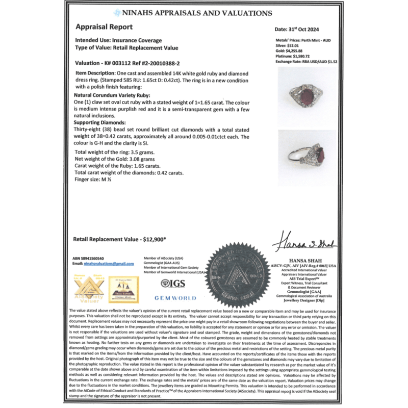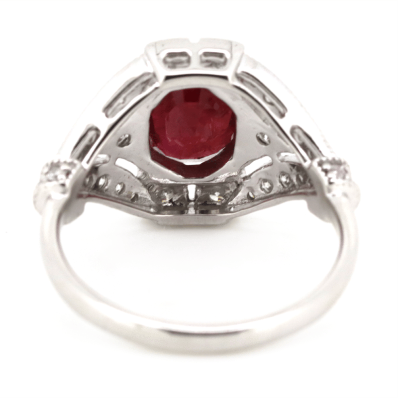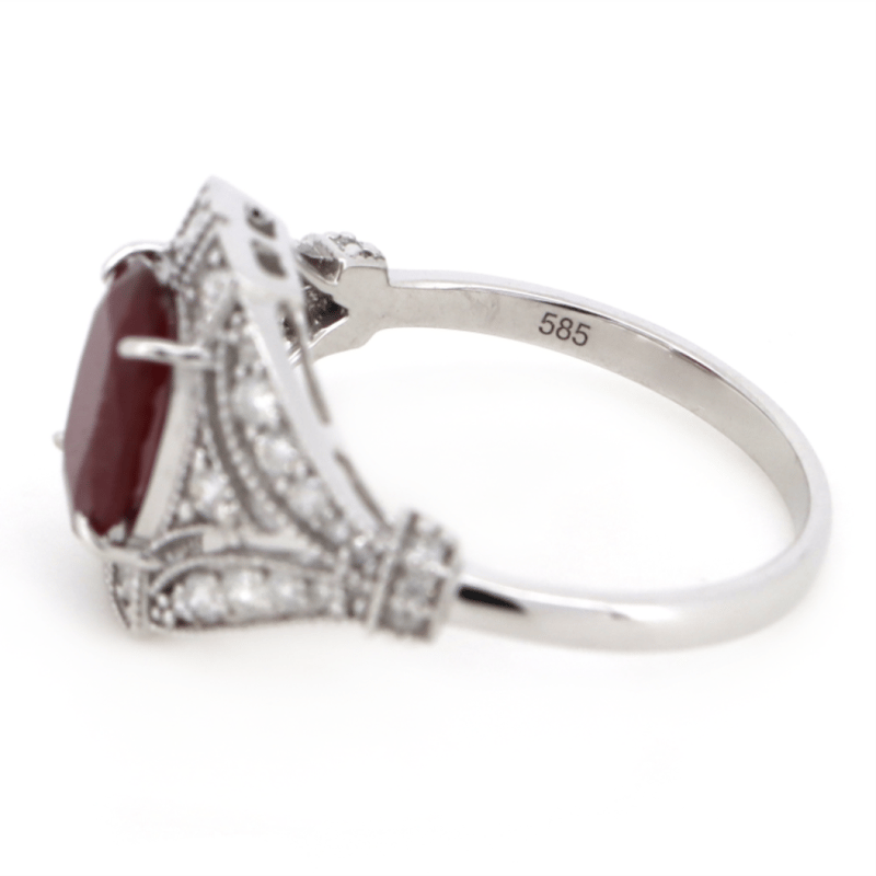 14K WHITE GOLD, RUBY AND DIAMOND, ANTIQUE INSPIRED RING. The Centre Features, One Oval Cut, Medium Purplish-Red, Ruby, (1.65Ct, Natural Inclusions), 4 Claw Set. Encompassing The Design Are, 38 Round Brilliant Cut Diamonds, (0.42Ct Tdw, G-H Colour, Si Clarity), Bead Set. Ring Size N. Valuations Provided by an Independent Third-Party Professional Not Directly Associated With Lloyds Auctions at AUD $$12,900.00This valuation has been conducted by an independent third-party professional. The valuation amount is an assessment by the issuing valuer and does not reflect the auction value of the item. Any inquiries regarding the valuation should be directed to the issuing valuer (refer to contact details on the certificate), as Lloyds Auctions has no affiliation or influence over the valuation, the valuer, or the stated amount. Condition: Good - Refer Images 0645888+1333