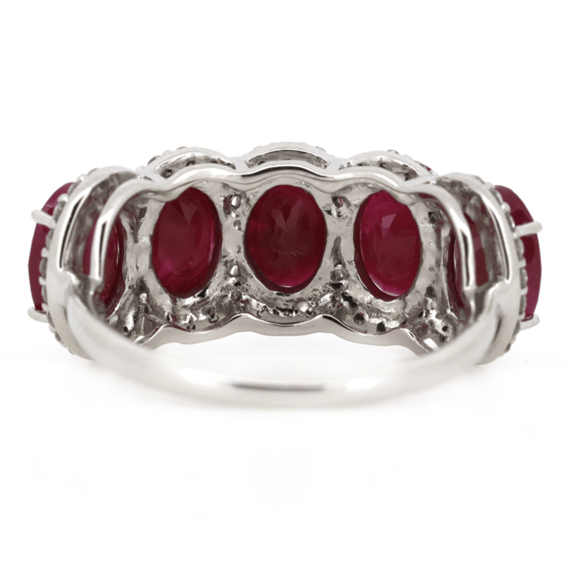 14K WHITE GOLD, RUBY AND DIAMOND, ETERNITY RING. The Central Design Features, 5 Oval Faceted Cut, Medium Dark Pinkish-Red, Rubies (6.02Ct Tsw, Included, Enhanced), Claw Set. Bordering The Design Are, 50 Round Brilliant Cut, Diamonds (0.25Ct Tdw, J-K Colour, Si2-I2 Clarity), Claw Set. Ring Size M 1/2. Valuations Provided by an Independent Third-Party Professional Not Directly Associated With Lloyds Auctions at AUD $$12,790.00This valuation has been conducted by an independent third-party professional. The valuation amount is an assessment by the issuing valuer and does not reflect the auction value of the item. Any inquiries regarding the valuation should be directed to the issuing valuer (refer to contact details on the certificate), as Lloyds Auctions has no affiliation or influence over the valuation, the valuer, or the stated amount. Condition: Good - Refer Images 0645888+1380