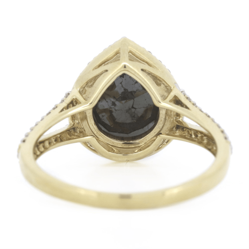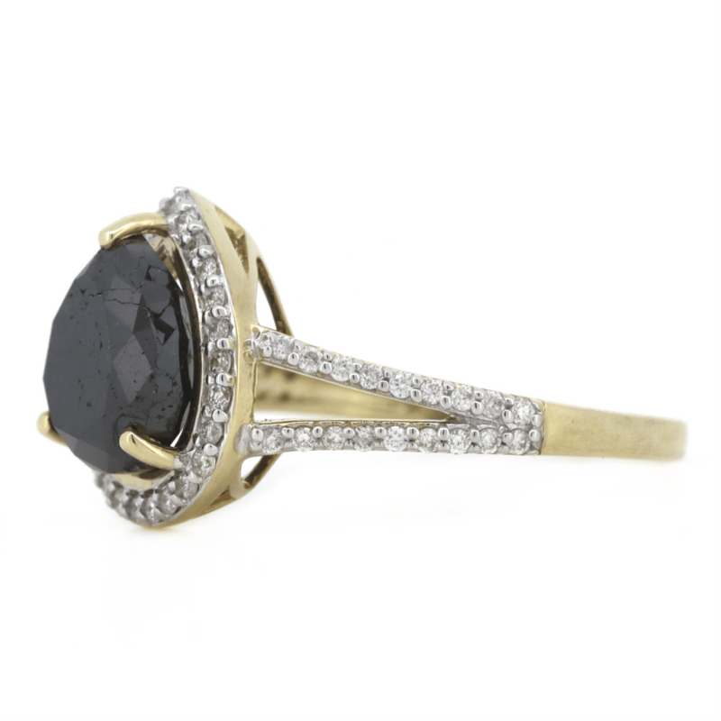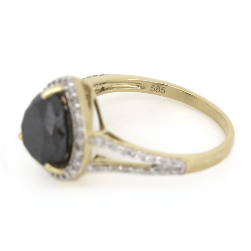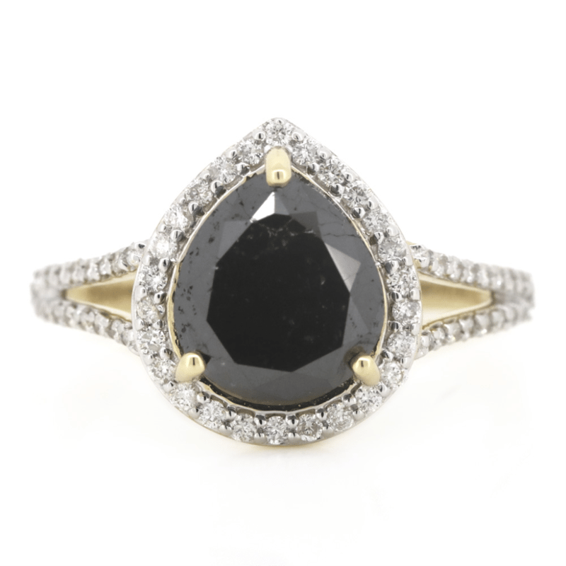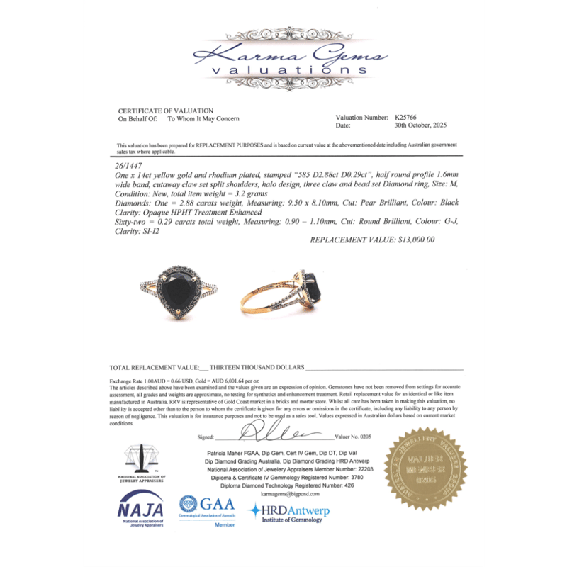 14K YELLOW GOLD, BLACK DIAMOND AND DIAMOND, SPLIT BAND RING. The Centre Features, One Pear Brilliant Cut, Black, Diamond (2.88Ct, Hpht Enhanced, Opaque), 3 Claw Set. Surrounding The Centre In A Halo And Decorating The Split Band Are, 62 Round Brilliant Cut, Diamonds (0.29Ct Tdw, G-J Colour, Si-I2 Clarity), Claw Set. Ring Size M. Valuations Provided by an Independent Third-Party Professional Not Directly Associated With Lloyds Auctions at AUD $$13,000.00This valuation has been conducted by an independent third-party professional. The valuation amount is an assessment by the issuing valuer and does not reflect the auction value of the item. Any inquiries regarding the valuation should be directed to the issuing valuer (refer to contact details on the certificate), as Lloyds Auctions has no affiliation or influence over the valuation, the valuer, or the stated amount. Condition: Good - Refer Images 0645888+1365