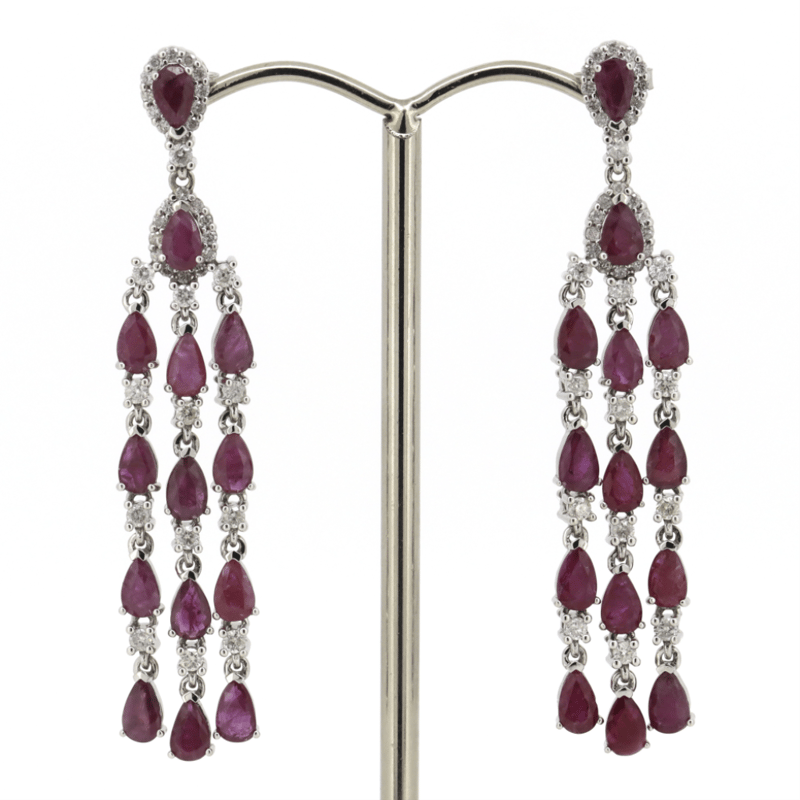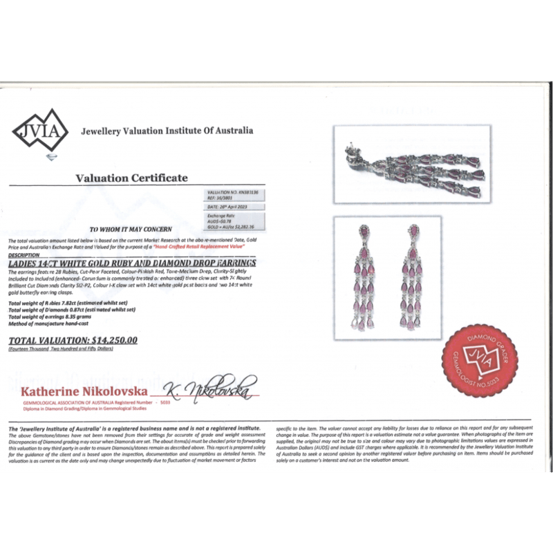 14K WHITE GOLD, RUBY AND DIAMOND, CHANDELIER EARRINGS. The Centre Features, 28 Pear Faceted Cut, Medium Deep Pinkish-Red, Rubies (7.82Ct Tsw, Slightly Included To Included, Heat Enhanced), 3 Claw Set. Accompanied By, 74 Round Brilliant Cut, Diamonds (0.87Ct Tdw, I-K Colour, Si2-P2 Clarity), Claw Set. The Earrings Have Post Backs With 14K White Gold Butterfly Clasps. Valuations Provided by an Independent Third-Party Professional Not Directly Associated With Lloyds Auctions at AUD $$14,250.00This valuation has been conducted by an independent third-party professional. The valuation amount is an assessment by the issuing valuer and does not reflect the auction value of the item. Any inquiries regarding the valuation should be directed to the issuing valuer (refer to contact details on the certificate), as Lloyds Auctions has no affiliation or influence over the valuation, the valuer, or the stated amount. Condition: Good - Refer Images 0645888+1371