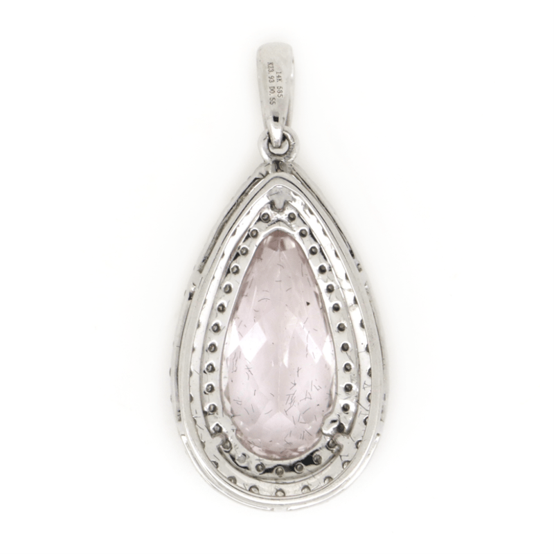 14K WHITE GOLD, KUNZITE AND DIAMOND, DOUBLE HALO PENDANT. The Centre Features, One Pear Cut, Pinkish-Purple, Kunzite (3.93Ct, Eye Clean Clarity), Claw Set. Surrounding The Centre In A Double Halo And Decorating The Bail Are, 69 Round Brilliant Cut, Diamonds (0.55Ct Tdw, J-K Colour, Si2-I2 Clarity), Micro-Claw Set. Valuations Provided by an Independent Third-Party Professional Not Directly Associated With Lloyds Auctions at AUD $$6,790.00This valuation has been conducted by an independent third-party professional. The valuation amount is an assessment by the issuing valuer and does not reflect the auction value of the item. Any inquiries regarding the valuation should be directed to the issuing valuer (refer to contact details on the certificate), as Lloyds Auctions has no affiliation or influence over the valuation, the valuer, or the stated amount. Condition: Good - Refer Images 0645888+1369