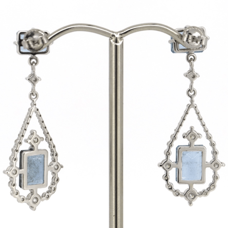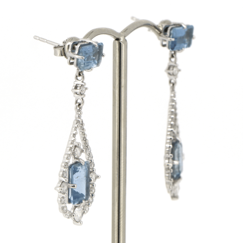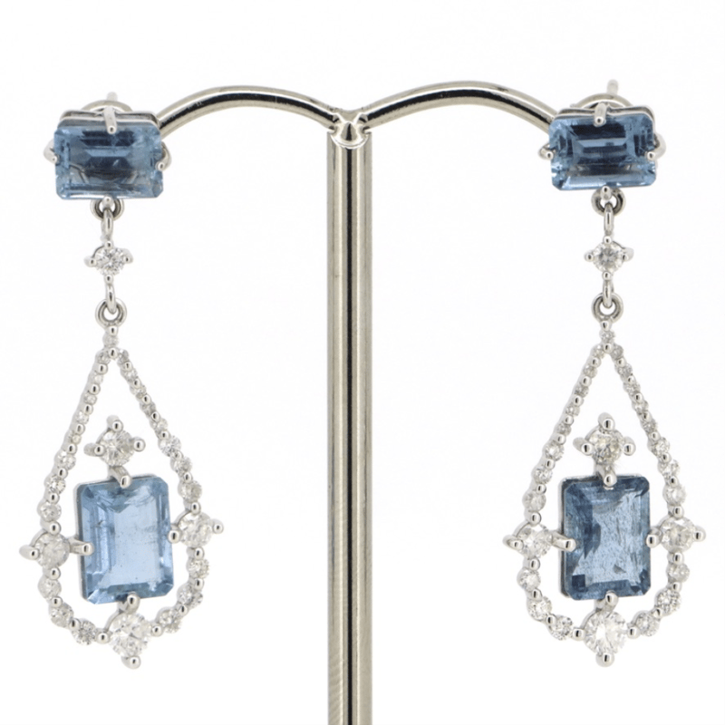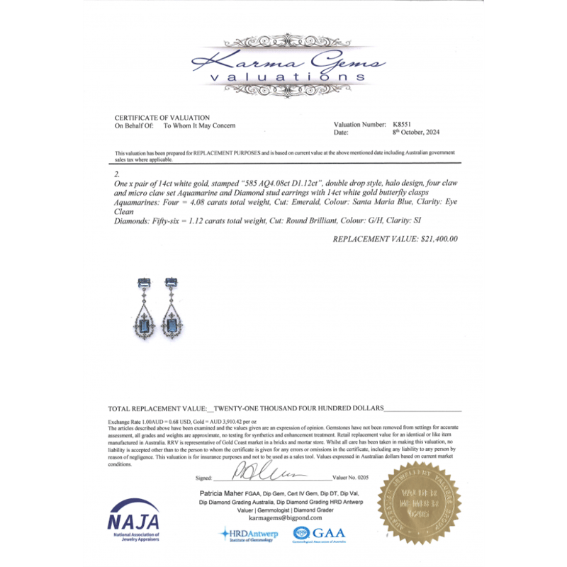 14K WHITE GOLD, SANTA MARIA BLUE AQUAMARINE AND DIAMOND, DROP EARRINGS. The Design Features, 4 Emerald Cut, Santa Maria Blue, Aquamarine (4.08Ct Tsw, Eye Clean Clarity), Claw Set. Surrounding The Stones In Halos And Decorating The Joins Are, 56 Round Brilliant Cut, Diamonds (1.12Ct Tdw, G-H Colour, Si Clarity), Micro-Claw Set. The Earrings Have Post Backs, With 14K White Gold Butterfly Clasps. Condition: New. Valuations Provided by an Independent Third-Party Professional Not Directly Associated With Lloyds Auctions at AUD $$21,400.00This valuation has been conducted by an independent third-party professional. The valuation amount is an assessment by the issuing valuer and does not reflect the auction value of the item. Any inquiries regarding the valuation should be directed to the issuing valuer (refer to contact details on the certificate), as Lloyds Auctions has no affiliation or influence over the valuation, the valuer, or the stated amount. Condition: Good - Refer Images 0645888+1395