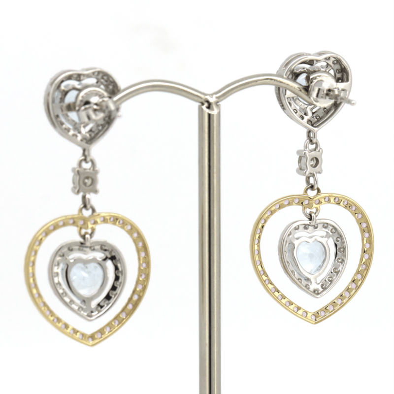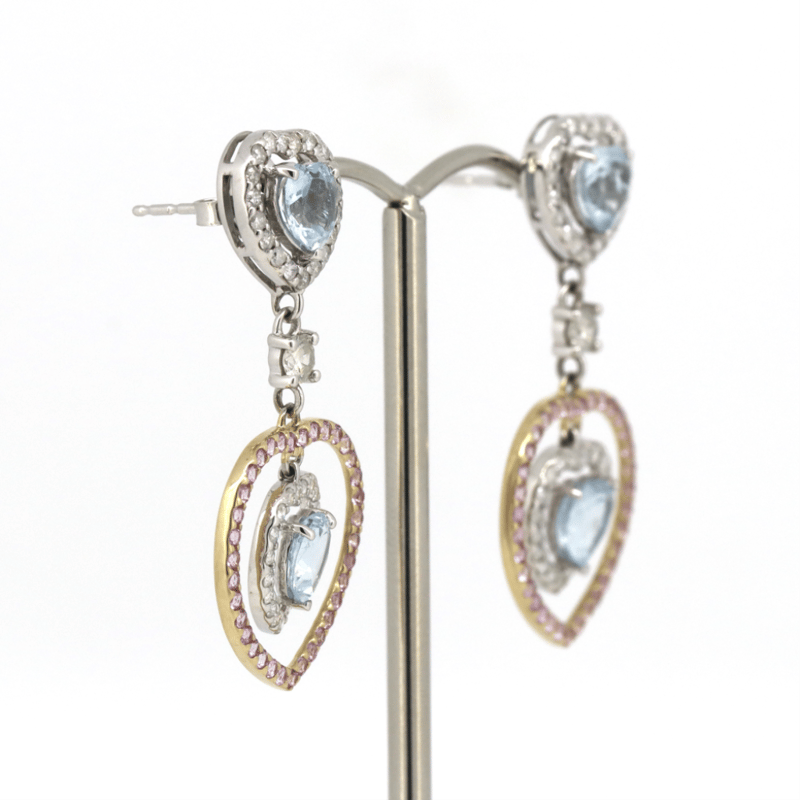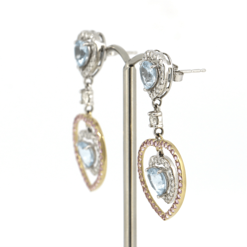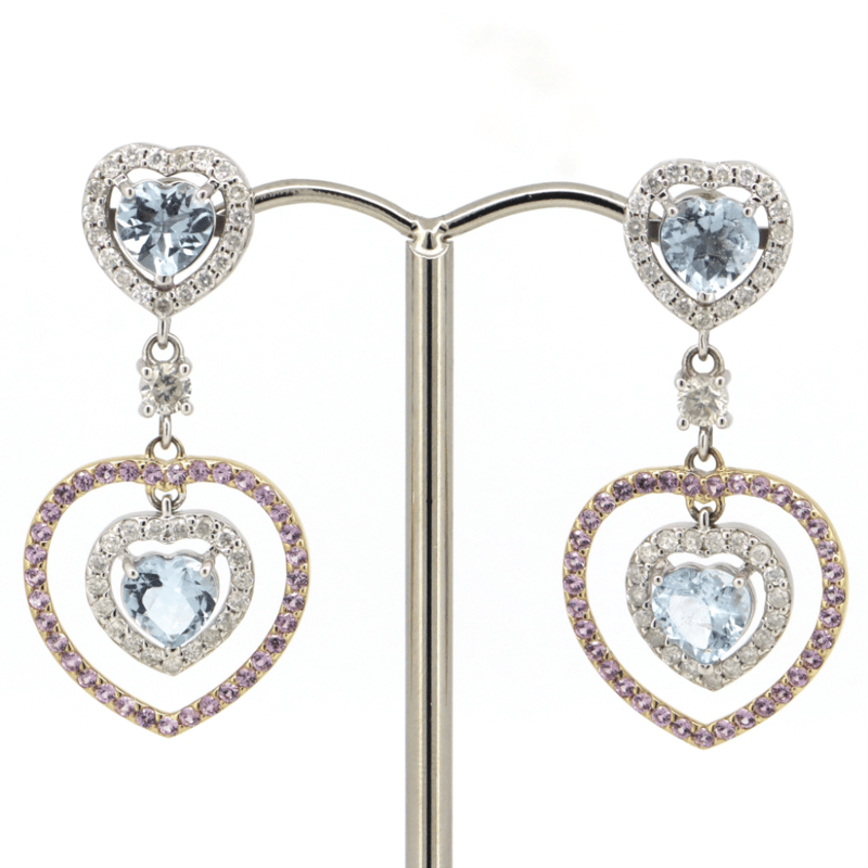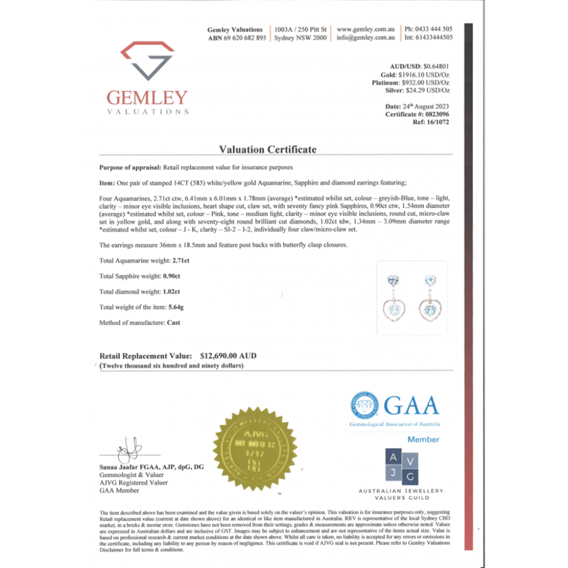 14K WHITE/YELLOW GOLD, AQUAMARINE PINK SAPPHIRE AND DIAMOND, DROP EARRINGS. The Design Features, 4 Heart Cut, Light Greyish-Blue, Aquamarines (2.71Ct, Minor Eye Visible Inclusions), Claw Set. Surrounding The Aquamarines And Decorating The Settings Are, 78 Round Brilliant Cut, Diamonds (1.02Ct Tdw, J-K Colour, Si2-I2 Clarity), Claw Set. Accompanied By, 70 Round Cut, Fancy Pink, Sapphires (0.90Ct Tsw, Minor Eye Visible Inclusions), Micro-Claw Set. The Earrings Have Post Backs, With 14K White Gold Butterfly Clasps. Valuations Provided by an Independent Third-Party Professional Not Directly Associated With Lloyds Auctions at AUD $$12,690.00This valuation has been conducted by an independent third-party professional. The valuation amount is an assessment by the issuing valuer and does not reflect the auction value of the item. Any inquiries regarding the valuation should be directed to the issuing valuer (refer to contact details on the certificate), as Lloyds Auctions has no affiliation or influence over the valuation, the valuer, or the stated amount. Condition: Good - Refer Images 0645888+1339