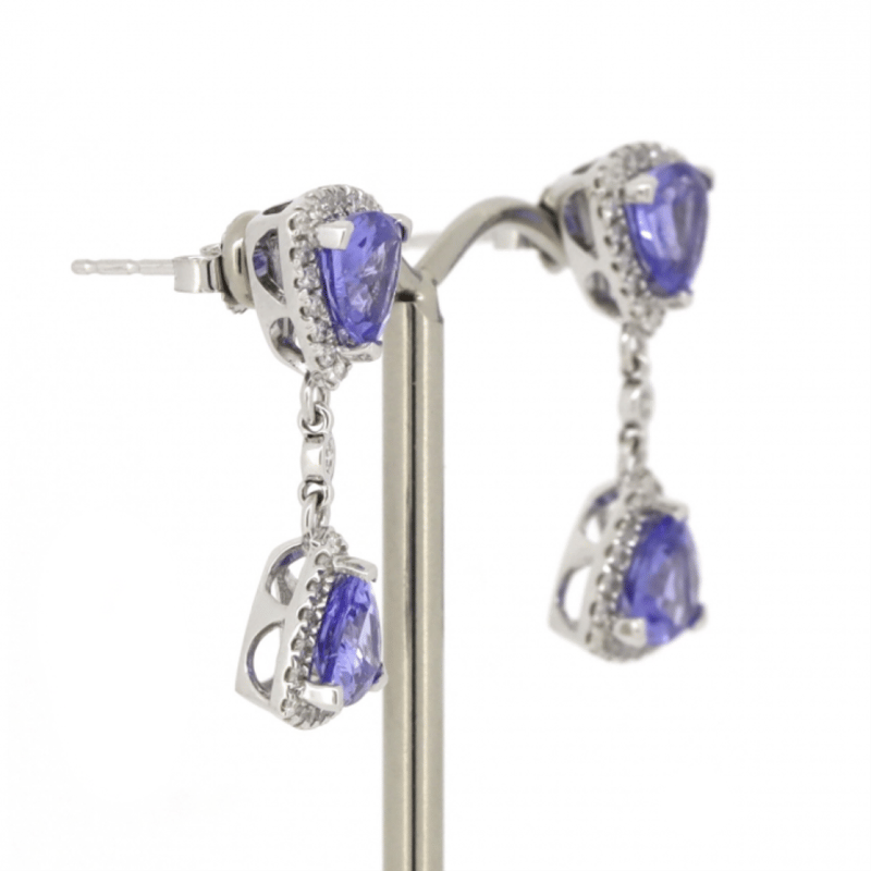14K WHITE GOLD, TANZANITE AND DIAMOND, DOUBLE DROP HALO EARRINGS. The Design Features, 4 Trillion Cut, Medium Purplish-Blue, Tanzanites (3.24Ct Tsw, Minor Eye Visible Inclusions), Claw Set. Surrounding The Centres In Halos And Decorating The Joins Are, 74 Round Brilliant Cut, Diamonds (0.57Ct Tdw, J-K Colour, Si2-I2 Clarity), Bezel/Micro-Claw Set. The Earrings Have Post Backs, With 14K White Gold Butterfly Clasps. Valuations Provided by an Independent Third-Party Professional Not Directly Associated With Lloyds Auctions at AUD $$8,890.00This valuation has been conducted by an independent third-party professional. The valuation amount is an assessment by the issuing valuer and does not reflect the auction value of the item. Any inquiries regarding the valuation should be directed to the issuing valuer (refer to contact details on the certificate), as Lloyds Auctions has no affiliation or influence over the valuation, the valuer, or the stated amount. Condition: Good - Refer Images 0645888+1324