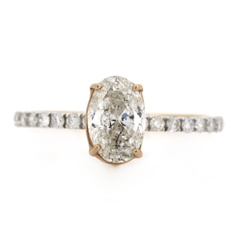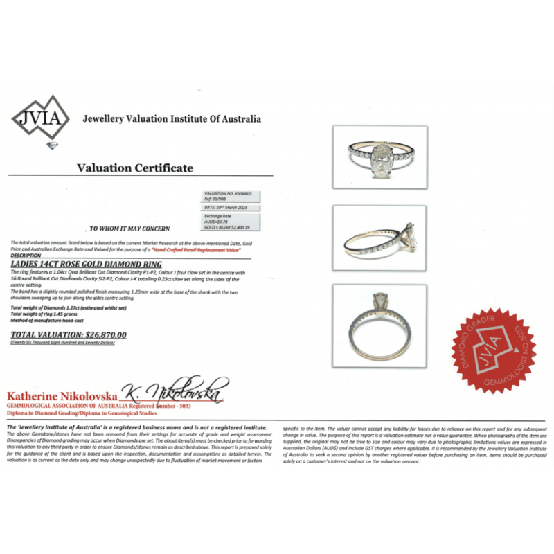 The Centre Features, One Oval Brilliant Cut, Diamond (1.04Ct, J Colour, P1-P2 Clarity), 4 Claw Set. Decorating The Band Are, 16 Round Brilliant Cut, Diamonds (0.23Ct Tdw, J-K Colour, Si2-P2 Clarity), Claw Set. Ring Size N.
