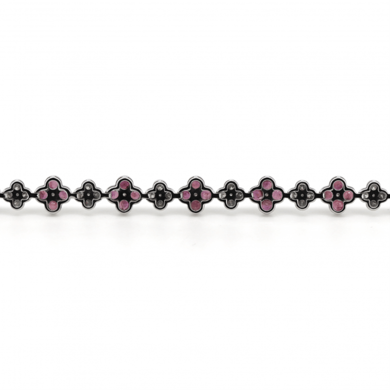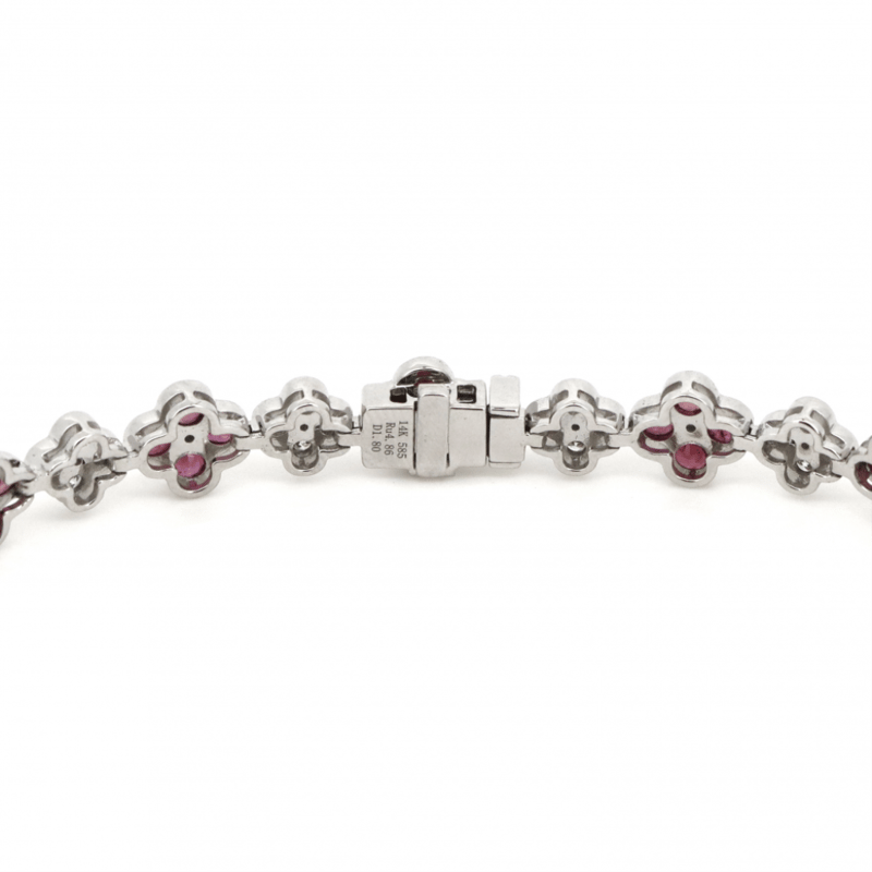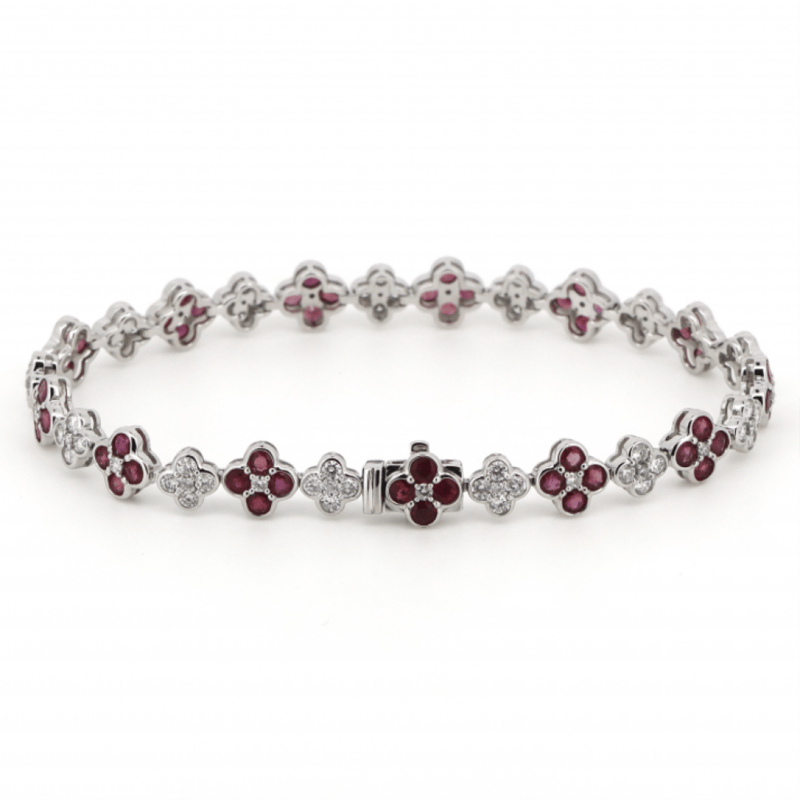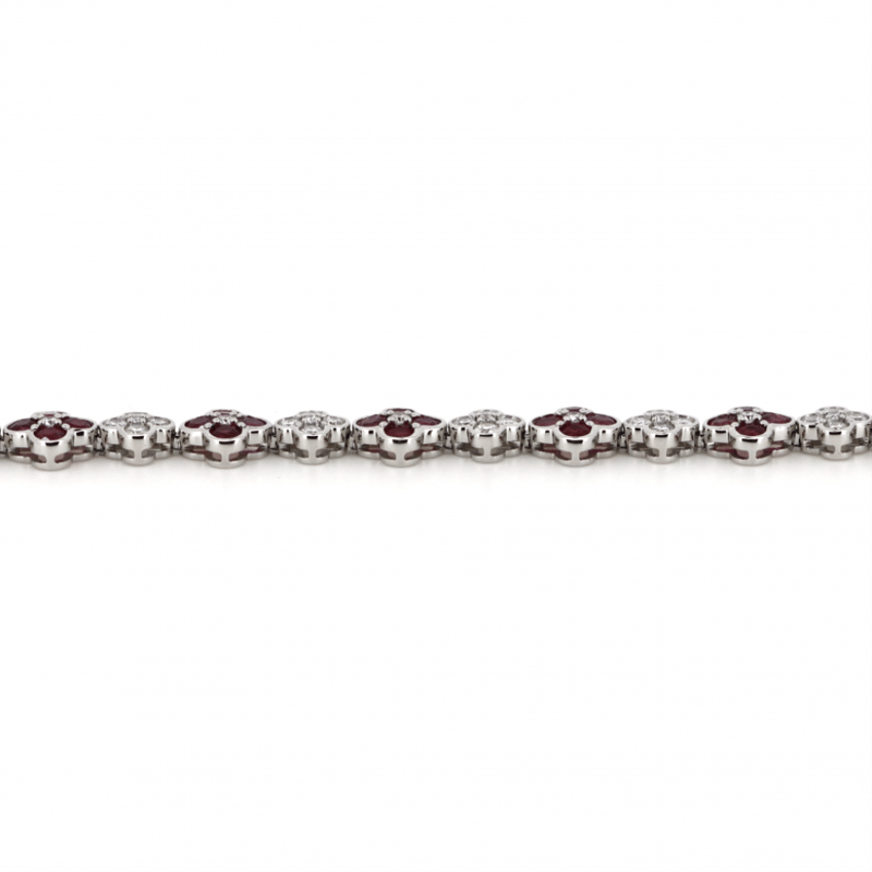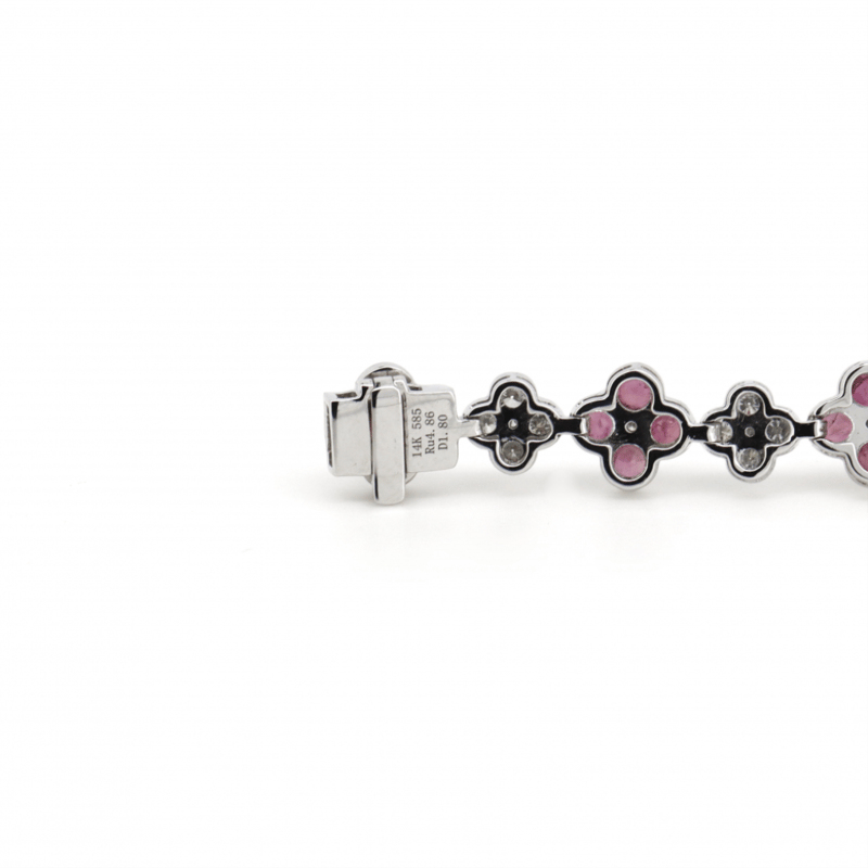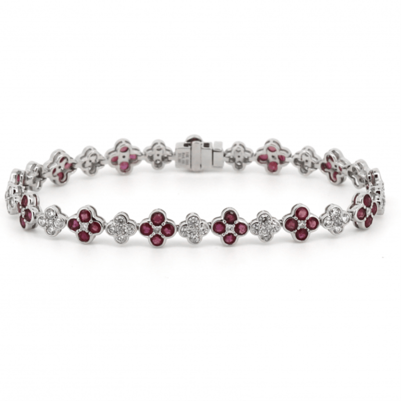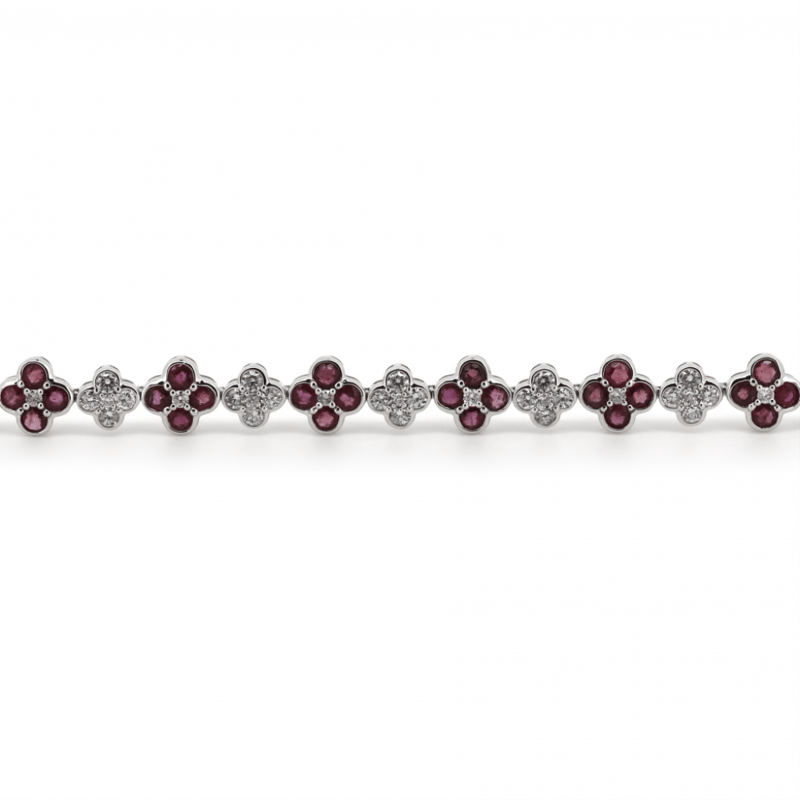 14K WHITE GOLD, RUBY AND DIAMOND, FLORAL BRACELET.