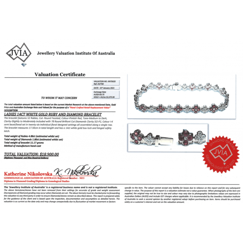 The Bracelet Features, 52 Round Faceted Cut, Pinkish-Red, Rubies (4.86Ct Tsw, Slightly-Moderately Included), Bezel Set. Decorating The Smaller Links Are, 78 Round Brilliant Cut, Diamonds (1.80Ct Tdw, I-K Colour, Si2-P2 Clarity), Semi-Bezel/Bead Set. The Bracelet Has Box Clasp Closure With One Safety Catch. Bracelet Length Is 17.3Cm.