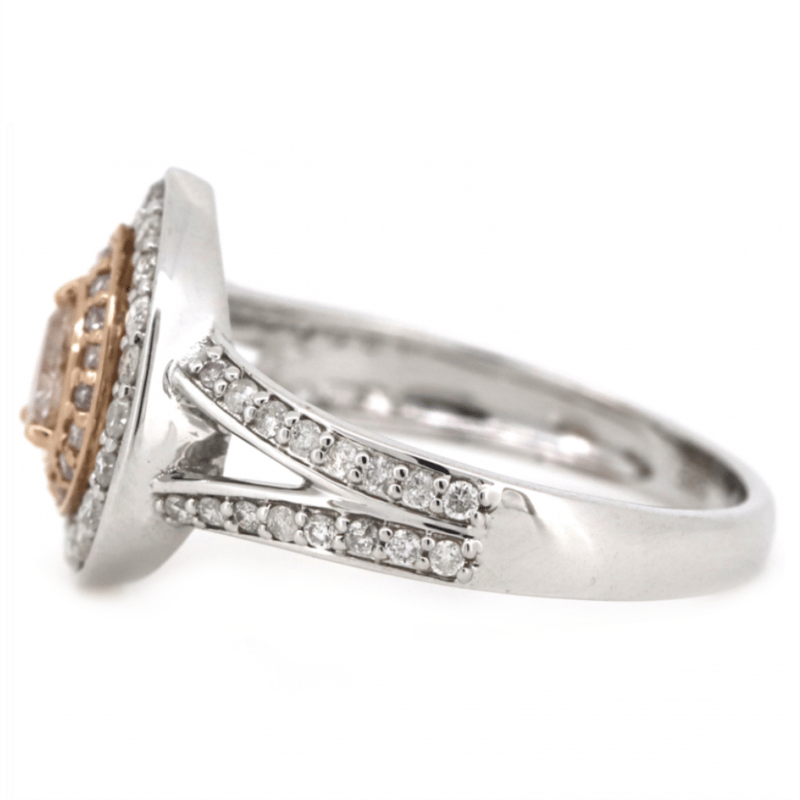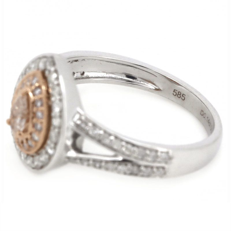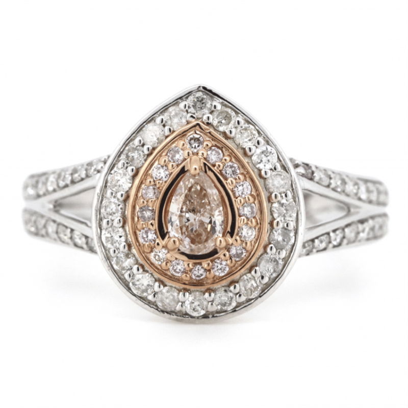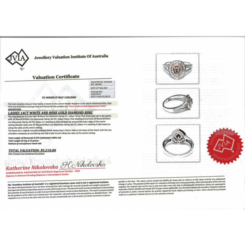 14K WHITE/ROSE GOLD, FANCY PINK DIAMOND, DOUBLE HALO SPLIT BAND RING. The Centre Features, One Pear Brilliant Cut, Fancy Pink, Diamond (0.14Ct, P1 Clarity), 3 Claw Set. Decorating The Innermost Halo Are, 16 Round Brilliant Cut, Fancy Pink, Diamonds (0.11Ct Tdw, Si2-P2 Clarity), Bead Set In Rose Gold. Decorating The Outermost Halo Are, 20 Round Brilliant Cut, Diamonds (0.14Ct Tdw, H-J Colour, Si2-P2 Clarity), Bead Set In White Gold. Decorating The Split Band Are, 32 Round Brilliant Cut, Diamonds (0.18Ct Tdw, H-J Colour, Si2-P2 Clarity), Bead Set In White Gold. Ring Size M 1/2. Valuations Provided by an Independent Third-Party Professional Not Directly Associated With Lloyds Auctions at AUD $$9,210.00This valuation has been conducted by an independent third-party professional. The valuation amount is an assessment by the issuing valuer and does not reflect the auction value of the item. Any inquiries regarding the valuation should be directed to the issuing valuer (refer to contact details on the certificate), as Lloyds Auctions has no affiliation or influence over the valuation, the valuer, or the stated amount. Condition: Good - Refer Images 0645913+5