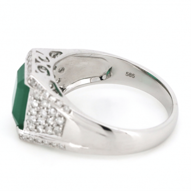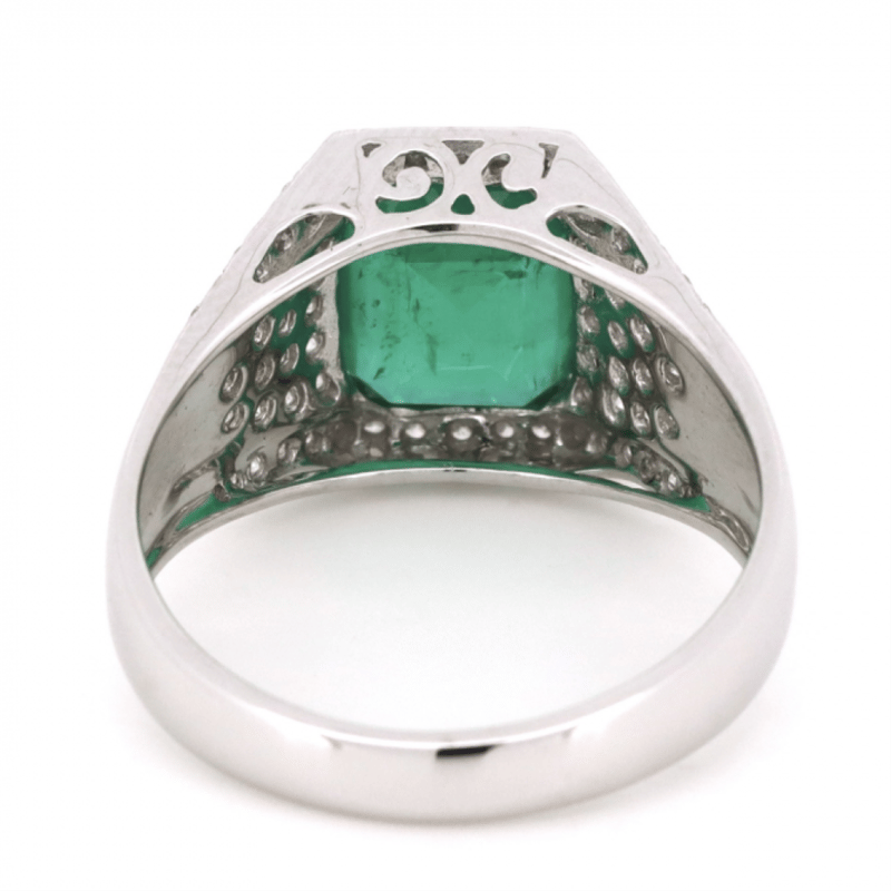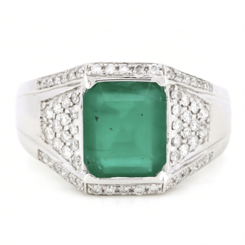 14K WHITE GOLD, EMERALD AND DIAMOND, GENTS RING. The Centre Features, One Emerald Cut, Bluish-Green, Emerald (3.05Ct, Moderate Eye Visible Inclusions), Bar Set. Encompassing The Centre Are, 62 Round Brilliant Cut, Diamonds (0.54Ct Tdw, J-K Colour, Si2-I2 Clarity), Pave/Bead Set. Ring Size T. Valuations Provided by an Independent Third-Party Professional Not Directly Associated With Lloyds Auctions at AUD $$12,590.00This valuation has been conducted by an independent third-party professional. The valuation amount is an assessment by the issuing valuer and does not reflect the auction value of the item. Any inquiries regarding the valuation should be directed to the issuing valuer (refer to contact details on the certificate), as Lloyds Auctions has no affiliation or influence over the valuation, the valuer, or the stated amount. Condition: Good - Refer Images 0645913+8