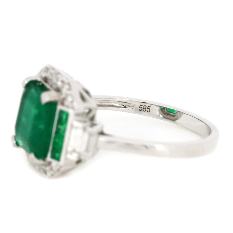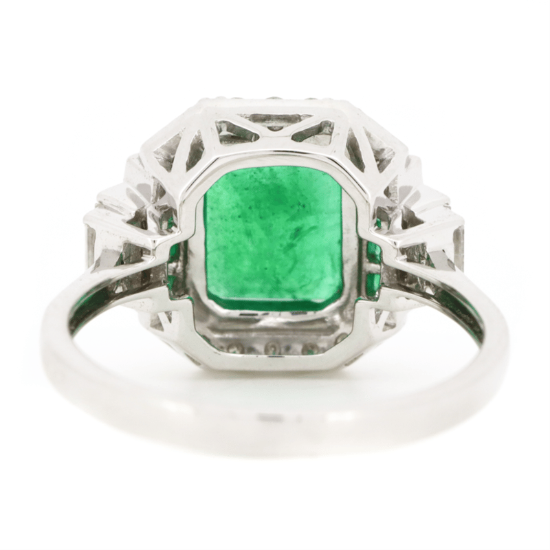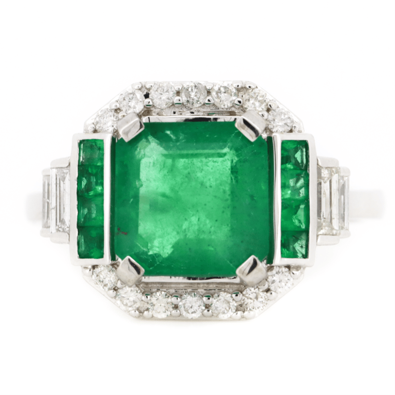14K WHITE GOLD, 2.32CT ZAMBIAN EMERALD AND DIAMOND, ART DECO INSPIRED RING. The Design Features, One Emerald Cut, Moderate Blue Green, Zambian Emerald (2.32Ct, Moderately Included), 4 Claw Set. Supporting The Design Are, 8 Princess Cut, Moderate Blue Green, Zambian Emeralds (0.19Ct Tsw, Moderately Included), Channel Set. Encompassing The Design Are, 14 Round Brilliant Cut, And 4 Baguette Cut, Diamonds (0.42Ct Tdw, G-H Colour, Si1-Si2 Clarity), Bead Set In White Gold. Ring Size O. Valuations Provided by an Independent Third-Party Professional Not Directly Associated With Lloyds Auctions at AUD $$22,000.00This valuation has been conducted by an independent third-party professional. The valuation amount is an assessment by the issuing valuer and does not reflect the auction value of the item. Any inquiries regarding the valuation should be directed to the issuing valuer (refer to contact details on the certificate), as Lloyds Auctions has no affiliation or influence over the valuation, the valuer, or the stated amount. Condition: Good - Refer Images 0645913+9