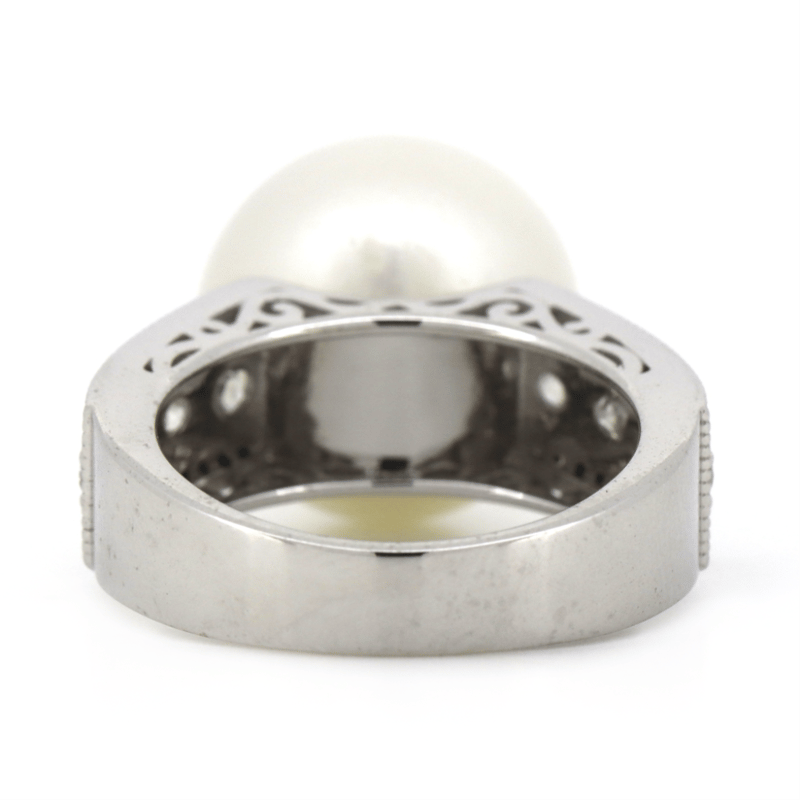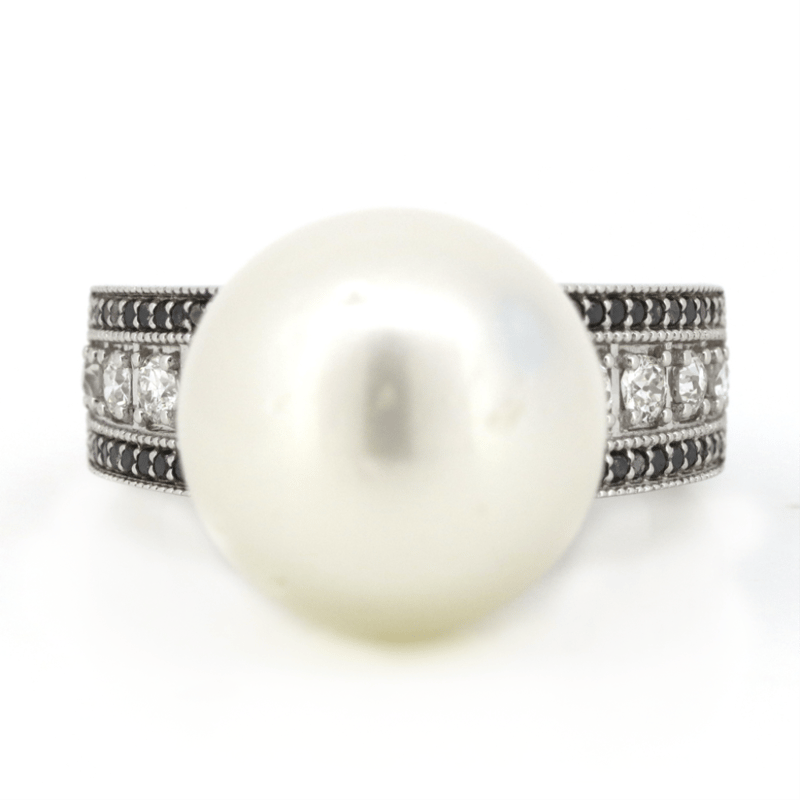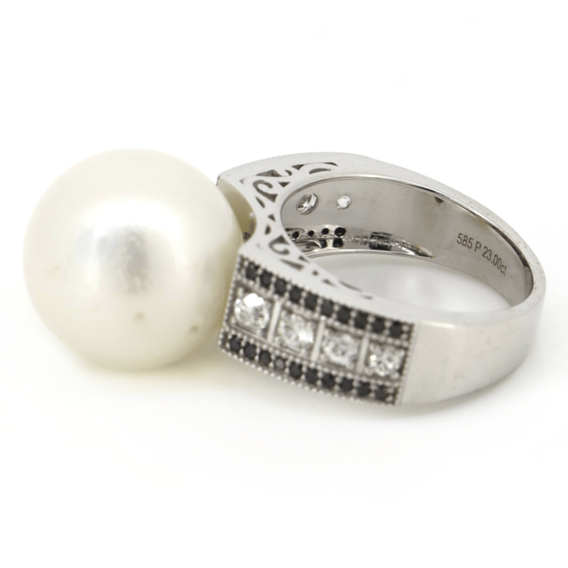 14K WHITE GOLD, WHITE CULTURED SOUTH SEA PEARL, DIAMOND AND BLACK DIAMOND, COCKTAIL RING. The Centre Features, One Round, Silvery White, Pearl Cultured South Sea Pearl (19.57Ct, Good Lustre). Cap Set. Decorating The Band Are, 8 Round Brilliant, Diamonds (0.49Ct Tdw, H-J Colour, Si Clarity), And 40 Round Brilliant Cut, Black, Diamonds (0.23Ct Tdw, Opaque ) Microbead Set. Ring Size N. Valuations Provided by an Independent Third-Party Professional Not Directly Associated With Lloyds Auctions at AUD $$20,150.00This valuation has been conducted by an independent third-party professional. The valuation amount is an assessment by the issuing valuer and does not reflect the auction value of the item. Any inquiries regarding the valuation should be directed to the issuing valuer (refer to contact details on the certificate), as Lloyds Auctions has no affiliation or influence over the valuation, the valuer, or the stated amount. Condition: Good - Refer Images 0645913+11