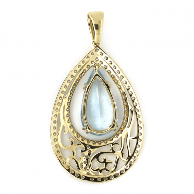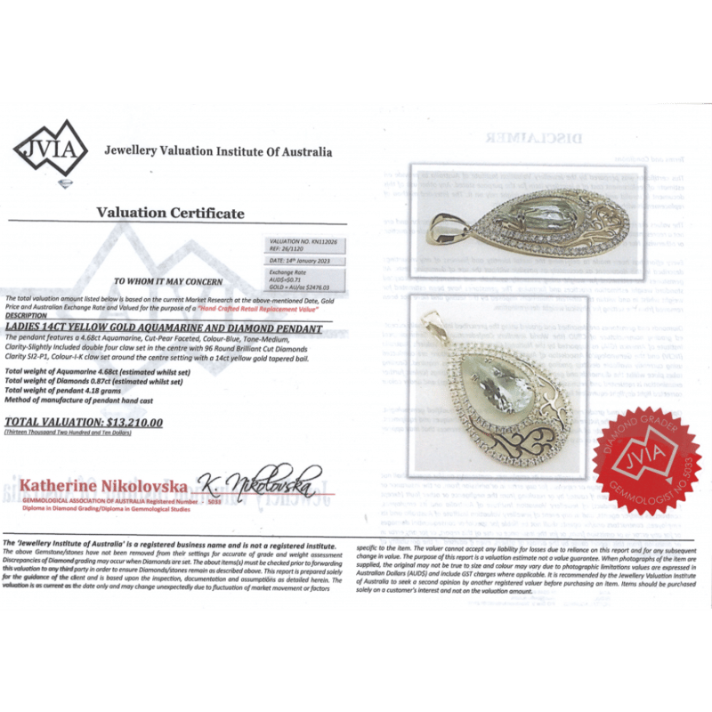 14K YELLOW GOLD, AQUAMARINE AND DIAMOND, DECORATIVE PENDANT. The Design Features, One Pear Faceted Cut, Medium Blue, Aquamarine (4.68Ct, Slightly Included), Claw Set. Decorating The Setting Are, 96 Round Brilliant Cut, Diamonds (0.87Ct Tdw, I-K Colour, Si2-P1 Clarity), Claw Set. Valuations Provided by an Independent Third-Party Professional Not Directly Associated With Lloyds Auctions at AUD $$13,210.00This valuation has been conducted by an independent third-party professional. The valuation amount is an assessment by the issuing valuer and does not reflect the auction value of the item. Any inquiries regarding the valuation should be directed to the issuing valuer (refer to contact details on the certificate), as Lloyds Auctions has no affiliation or influence over the valuation, the valuer, or the stated amount. Condition: Good - Refer Images 0645913+15