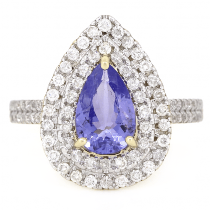 The Centre Features, One Pear Faceted Cut, Bluish-Purple, Tanzanite (1.08Ct, Slightly Included), Claw Set. Surrounding The Centre In A Double Halo And Decorating The Band Are, 84 Round Brilliant Cut, Diamonds (0.56Ct Tdw, I-K Colour, Si2-P2 Clarity), Claw Set. Ring Size M 1/2.
