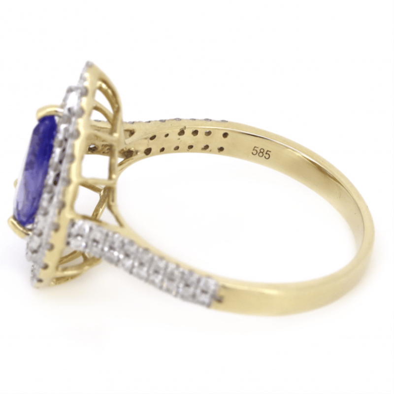 14K YELLOW GOLD, TANZANITE AND DIAMOND, DOUBLE HALO RING.