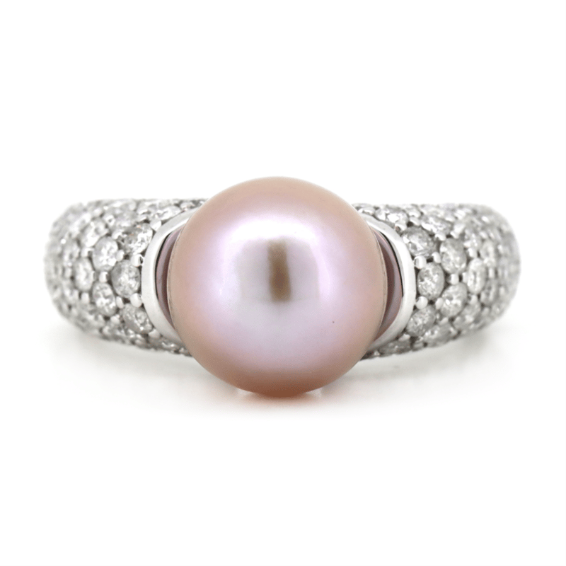 14K WHITE GOLD, PINK CULTURED SOUTH SEA PEARL AND DIAMOND, DRESS RING.