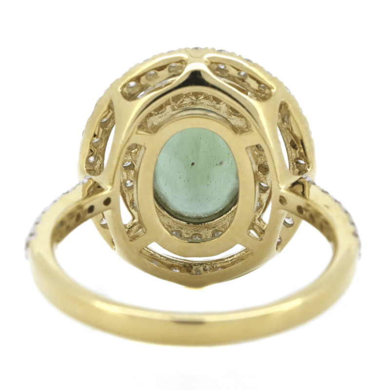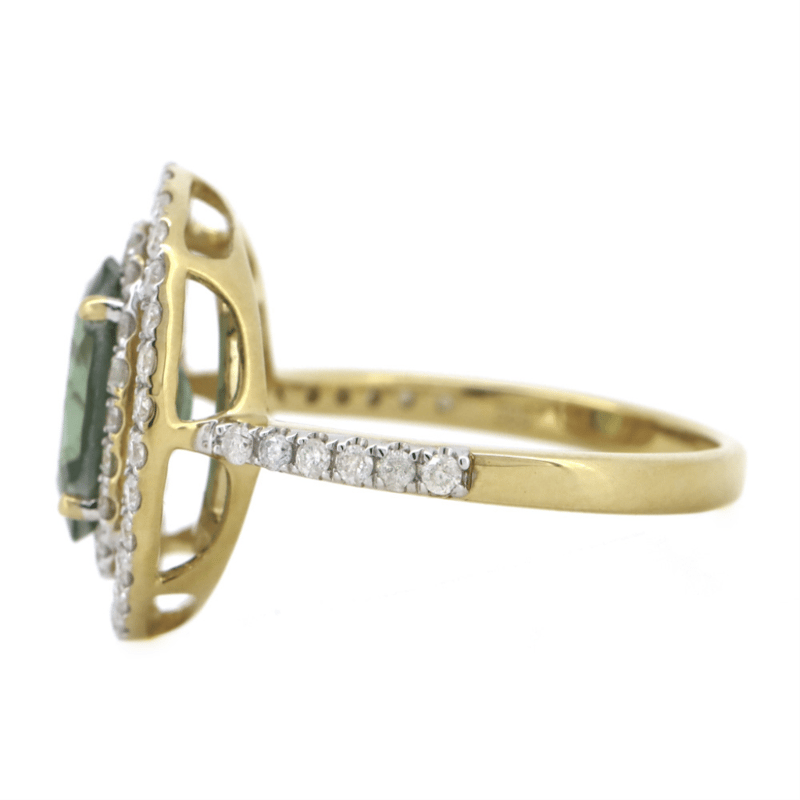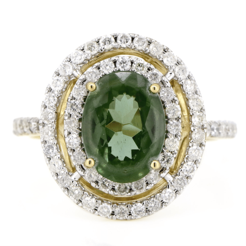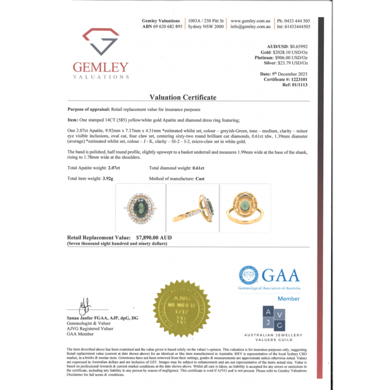 14K YELLOW GOLD, APATITE AND DIAMOND, DOUBLE HALO RING. The Centre Features, One Oval Cut, Medium Greyish-Green, Apatite (2.07Ct, Minor Eye Visible Inclusions), 4 Claw Set. Surrounding The Centre In A Double Halo And Decorating The Shoulders Are, 62 Round Brilliant Cut, Diamonds (0.61Ct Tdw, J-K Colour, Si2-I2 Clarity), Micro Claw Set In White Gold. Ring Size N. Valuations Provided by an Independent Third-Party Professional Not Directly Associated With Lloyds Auctions at AUD $$7,890.00This valuation has been conducted by an independent third-party professional. The valuation amount is an assessment by the issuing valuer and does not reflect the auction value of the item. Any inquiries regarding the valuation should be directed to the issuing valuer (refer to contact details on the certificate), as Lloyds Auctions has no affiliation or influence over the valuation, the valuer, or the stated amount. Condition: Good - Refer Images 0645913+32
