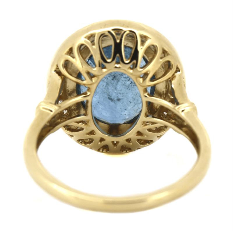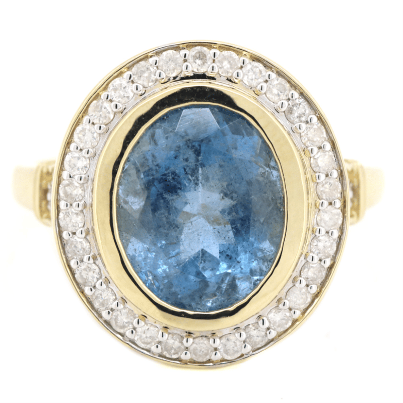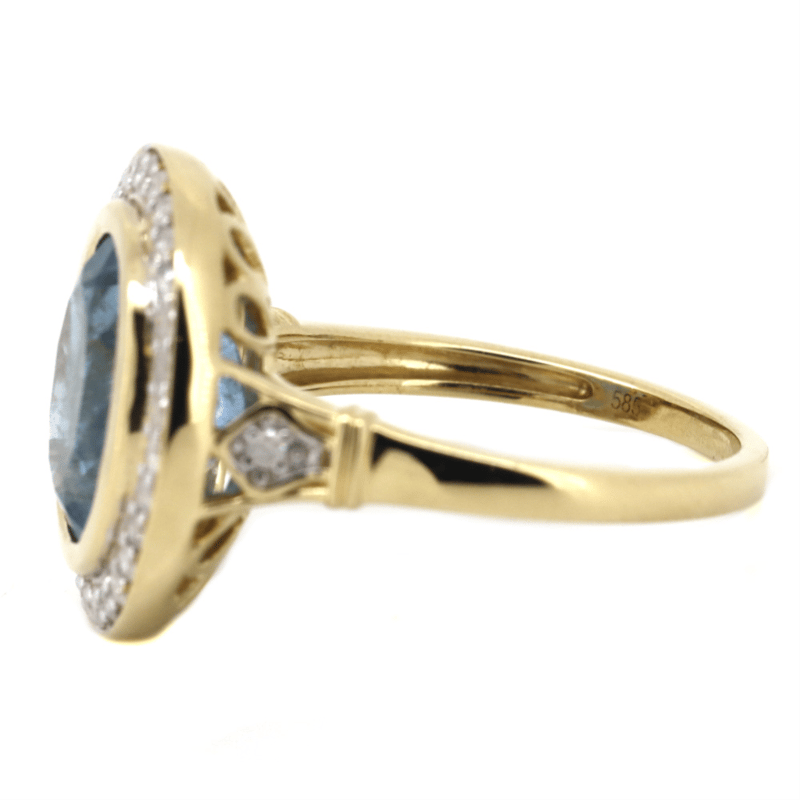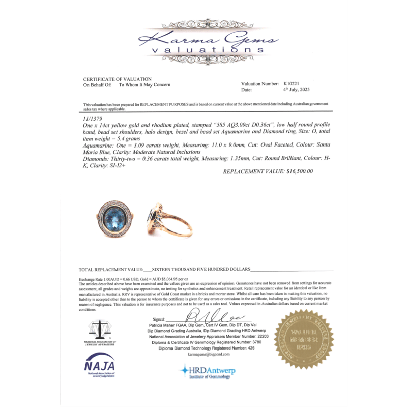 14K YELLOW GOLD, AQUAMARINE AND DIAMOND, HALO RING. The Centre Features, One Oval Cut, Santa Maria Blue, Aquamarine (3.09Ct, Moderate Naturally Included), Bezel Set. Surrounding The Centre In A Halo And Decorating The Shoulders Are, 32 Round Brilliant Cut, Diamonds (0.36Ct Tdw, H-K Colour, Si-I2+ Clarity), Bead Set. Ring Size O. Valuations Provided by an Independent Third-Party Professional Not Directly Associated With Lloyds Auctions at AUD $$16,500.00This valuation has been conducted by an independent third-party professional. The valuation amount is an assessment by the issuing valuer and does not reflect the auction value of the item. Any inquiries regarding the valuation should be directed to the issuing valuer (refer to contact details on the certificate), as Lloyds Auctions has no affiliation or influence over the valuation, the valuer, or the stated amount. Condition: Good - Refer Images 0645913+35