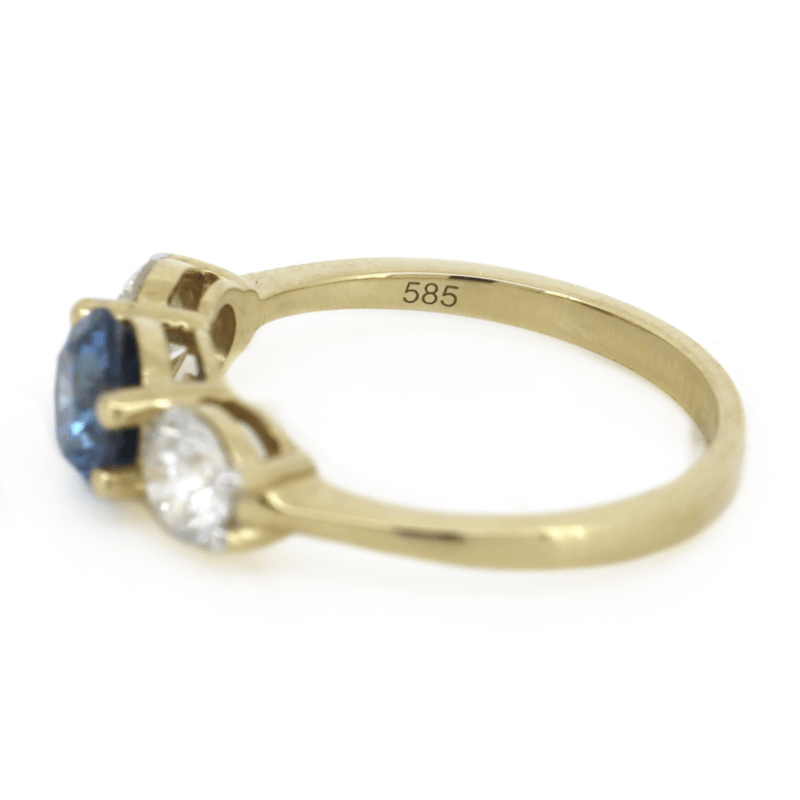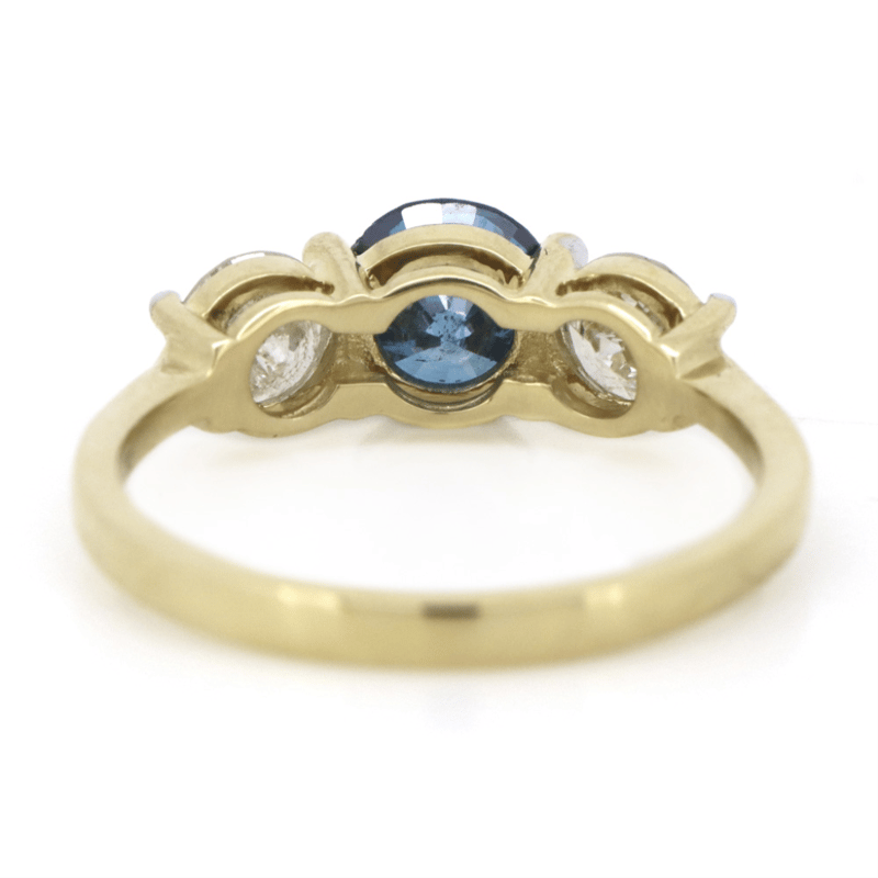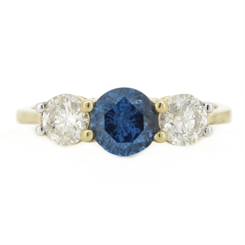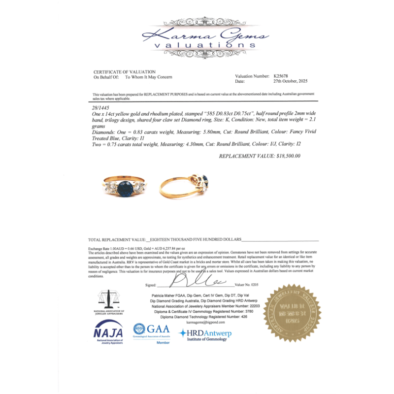 14K YELLOW GOLD, BLUE DIAMOND AND DIAMOND, TRILOGY RING. The Centre Features, One Round Brilliant Cut, Fancy Vivid Blue, Diamond (0.83Ct, I1 Clarity), 4 Claw Set. Flanking The Centre Are, 2 Round Brilliant Cut, Diamonds (0.75Ct Tdw, I-J Colour, I2 Clarity), 4 Claw Set. Ring Size K. Valuations Provided by an Independent Third-Party Professional Not Directly Associated With Lloyds Auctions at AUD $$18,500.00This valuation has been conducted by an independent third-party professional. The valuation amount is an assessment by the issuing valuer and does not reflect the auction value of the item. Any inquiries regarding the valuation should be directed to the issuing valuer (refer to contact details on the certificate), as Lloyds Auctions has no affiliation or influence over the valuation, the valuer, or the stated amount. Condition: Good - Refer Images 0645913+37