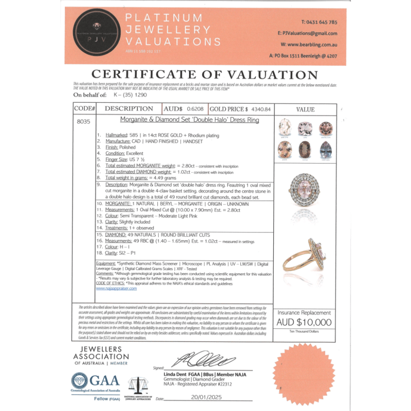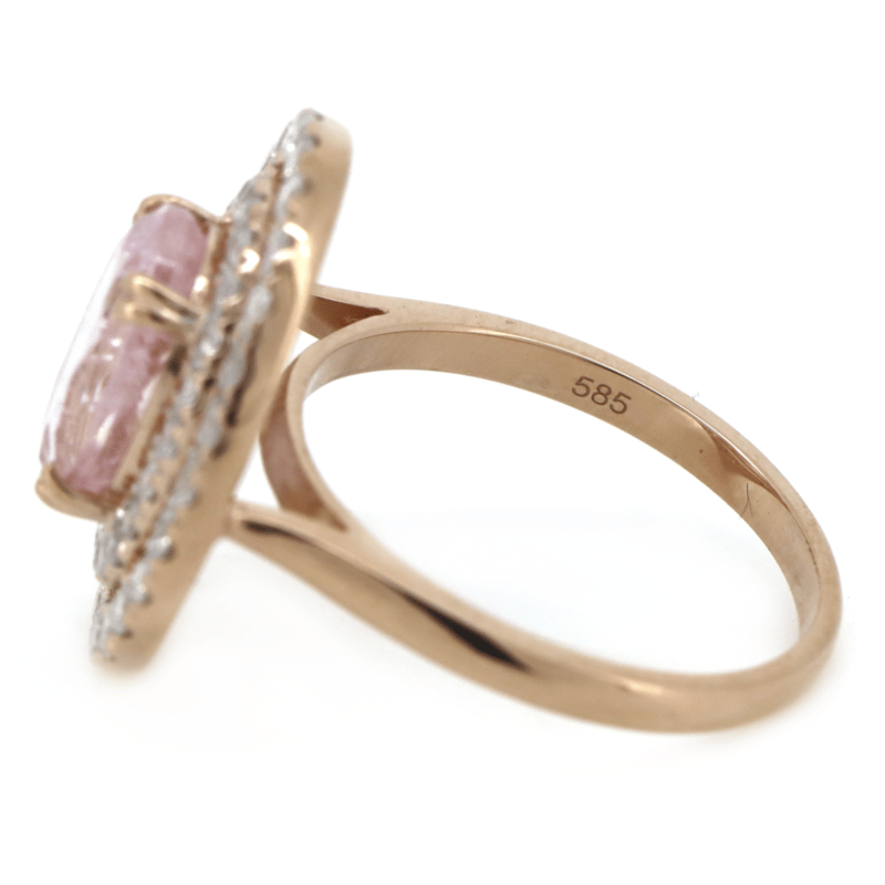 14K ROSE GOLD, MORGANITE AND DIAMOND, DOUBLE HALO RING. The Centre Features, One Oval Mixed Cut, Moderate Light Pink, Morganite (2.80Ct, Slightly Included), 4 Claw Basket Set. Surrounding The Centre In A Double Halo Are, 49 Round Brilliant Cut, Diamonds (1.02Ct Tdw, H-I Colour, Si2-P1 Clarity), Bead Set. Ring Size O 1/2. Valuations Provided by an Independent Third-Party Professional Not Directly Associated With Lloyds Auctions at AUD $$10,000.00This valuation has been conducted by an independent third-party professional. The valuation amount is an assessment by the issuing valuer and does not reflect the auction value of the item. Any inquiries regarding the valuation should be directed to the issuing valuer (refer to contact details on the certificate), as Lloyds Auctions has no affiliation or influence over the valuation, the valuer, or the stated amount. Condition: Good - Refer Images 0645913+38