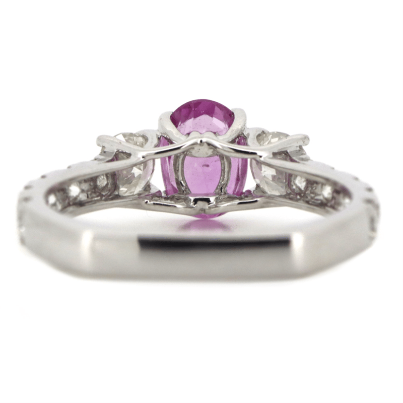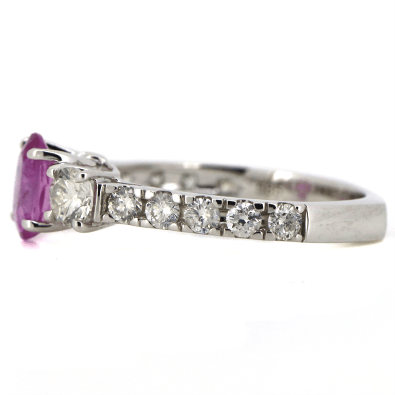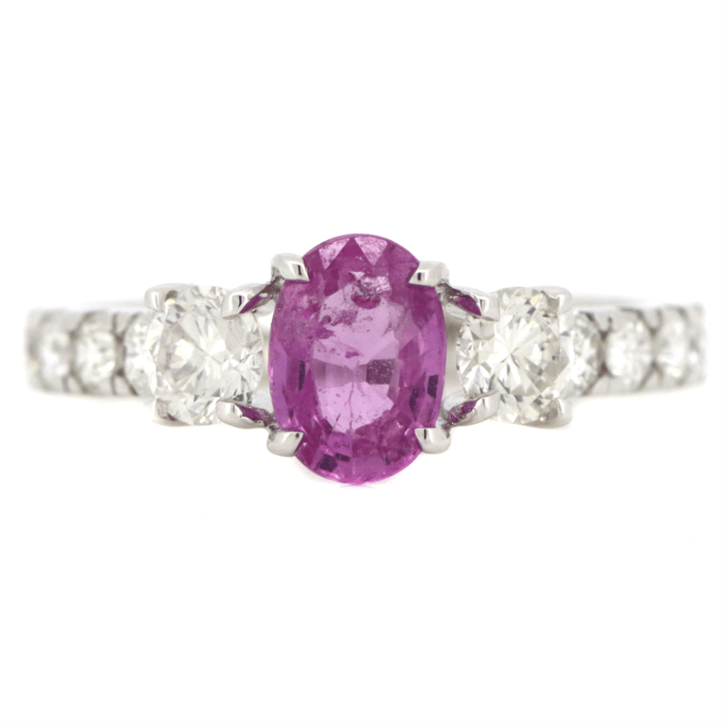The Centre Features, One Oval Mixed Cut, Strong Pink, Sapphire (1.03Ct, Moderate Natural Inclusions), 4 Claw Set. Flanking The Centre Are, 2 Round Brilliant Cut, Diamonds (0.51Ct Tdw, H Colour, Si1 Clarity), 4 Claw Set. Decorating The Band Are, 10 Round Brilliant Cut, Diamonds (0.49Ct Tdw, H Colour, Si-I2 Clarity), Claw Set. Ring Size M.