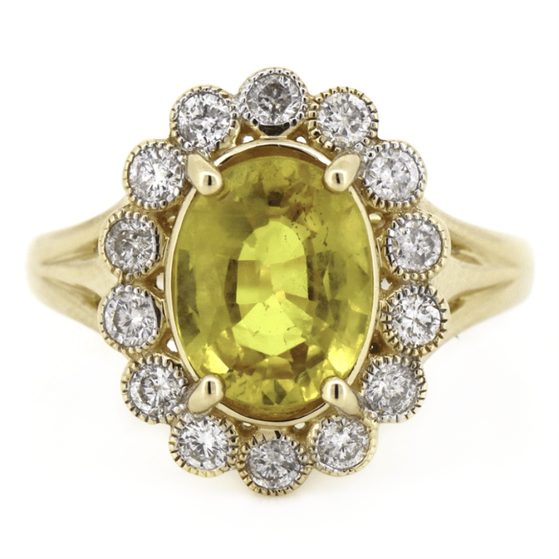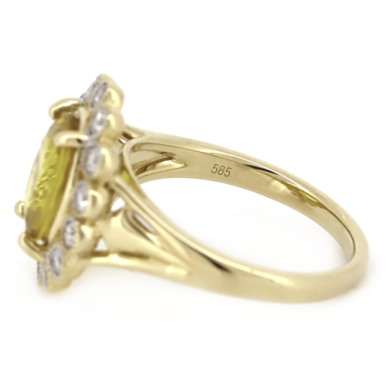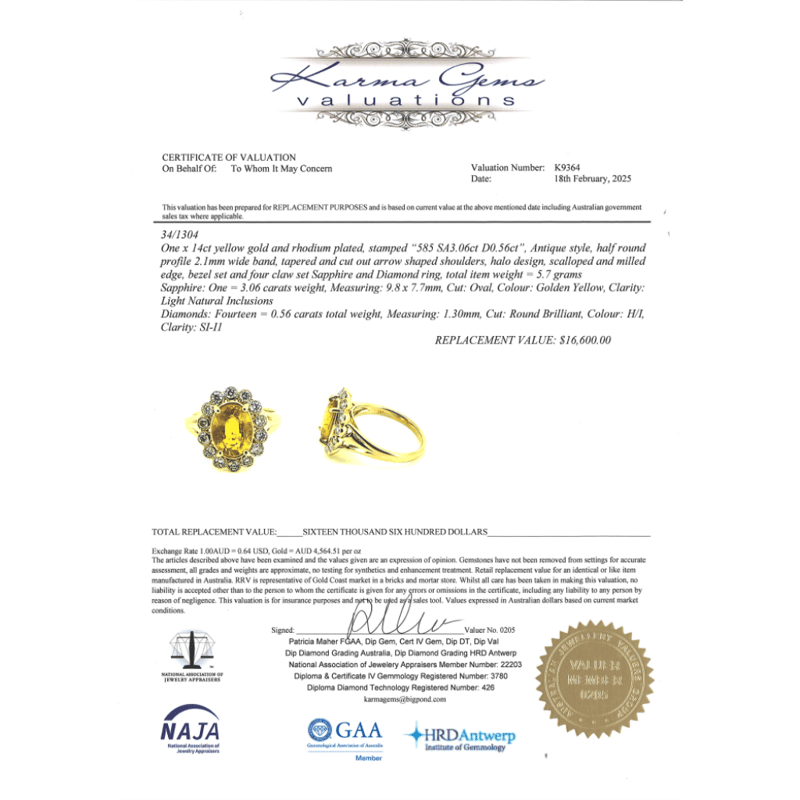 14K YELLOW GOLD, YELLOW SAPPHIRE AND DIAMOND, HALO RING. The Centre Features, One Oval Cut, Golden Yellow, Sapphire (3.06Ct, Lightly Included), 4 Claw Set. Surrounding The Centre In A Halo Are, 14 Round Brilliant Cut, Diamonds (0.56Ct Tdw, H-I Colour, Si-I1 Clarity), Individually Bead Set With Millegrain. Ring Size O. Valuations Provided by an Independent Third-Party Professional Not Directly Associated With Lloyds Auctions at AUD $$16,600.00This valuation has been conducted by an independent third-party professional. The valuation amount is an assessment by the issuing valuer and does not reflect the auction value of the item. Any inquiries regarding the valuation should be directed to the issuing valuer (refer to contact details on the certificate), as Lloyds Auctions has no affiliation or influence over the valuation, the valuer, or the stated amount. Condition: Good - Refer Images 0645913+42