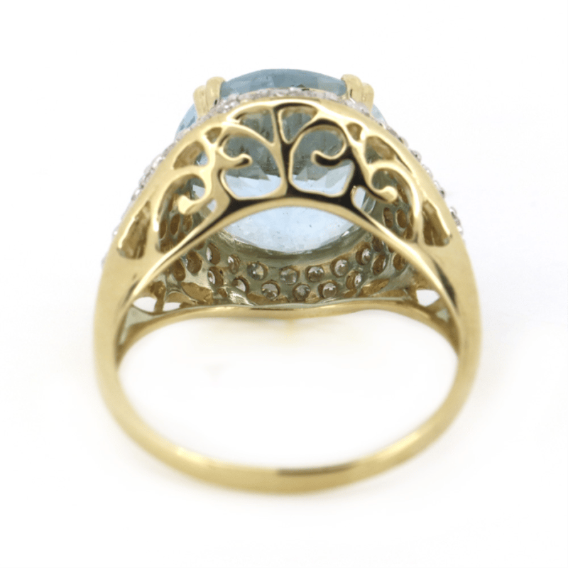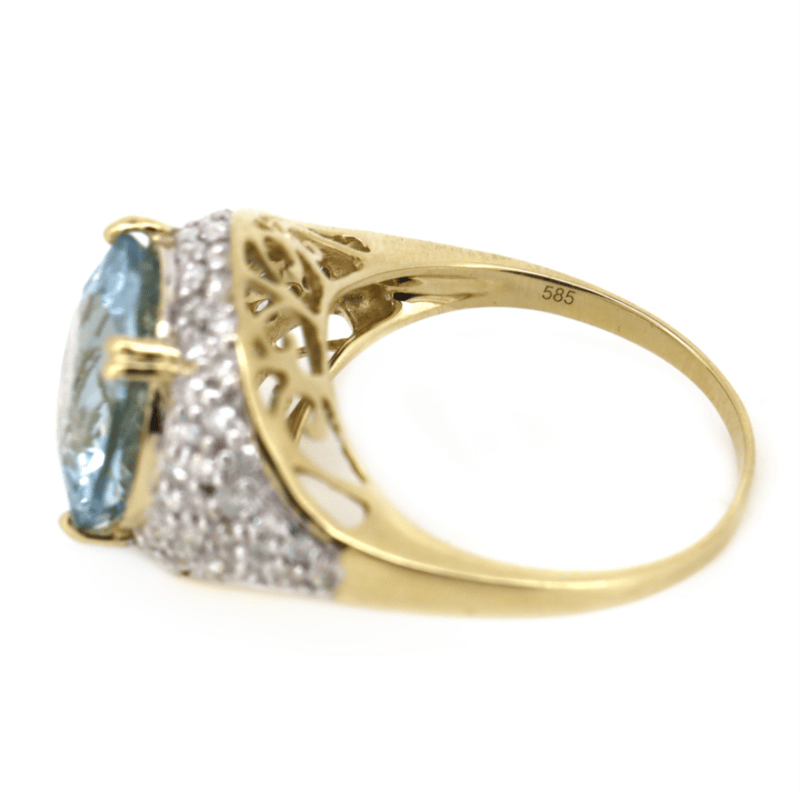 14K YELLOW GOLD, AQUAMARINE AND DIAMOND, CLUSTER RING.