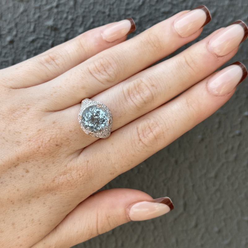 The Centre Features, One Round Cut, Sky Blue, Aquamarine (5.16Ct, Heavily Included), Double Claw Set. Encompassing The Centre Are, 70 Round Brilliant Cut, Diamonds (0.67Ct Tdw, H-I Colour, Si1-Si2 Clarity), Pave Set In White Gold. Ring Size L 1/2.