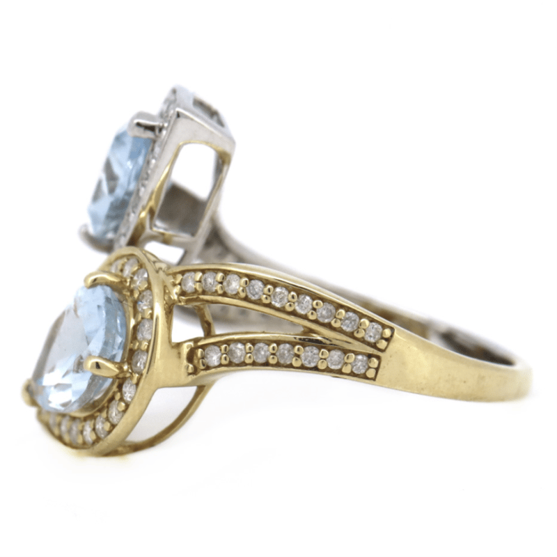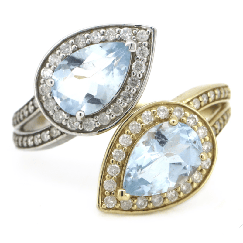 The Design Features, 2 Pear Cut, Medium Greyish-Blue, Aquamarines (2.21Ct Tsw, Eye Clean Clarity), 3 Claw Set. Accompanied By, 70 Round Brilliant Cut, Diamonds (0.48Ct Tdw, J-K Colour, Si1-I1 Clarity), Bead Set. Ring Size P-Q.
