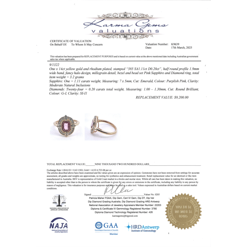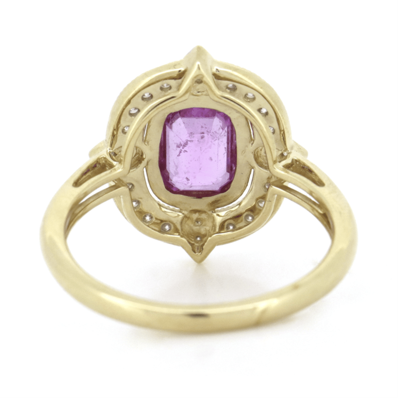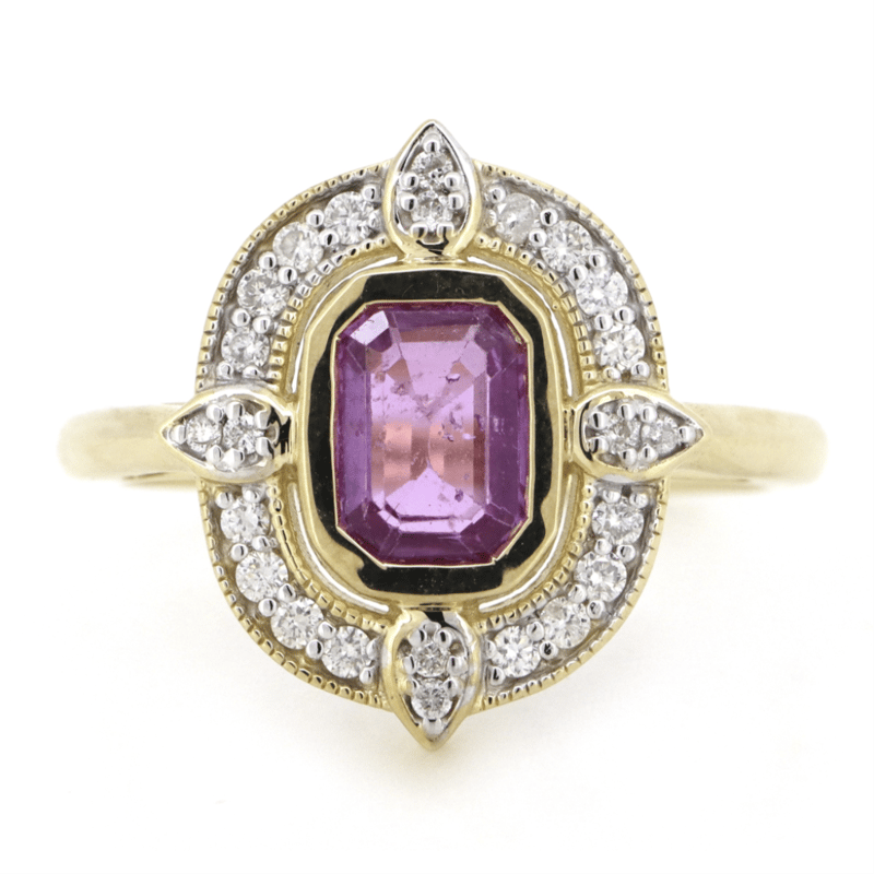 The Centre Features, One Emerald Cut, Purplish-Pink, Sapphire (1.11Ct, Natural Inclusions), Bezel Set. Encompassing The Centre Are, 24 Round Brilliant Cut, Diamonds (0.20Ct Tdw, G-I Colour, Si-I1 Clarity), Bead Set. Ring Size M.