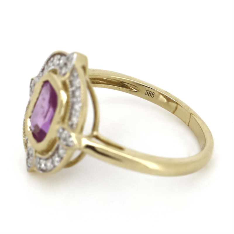 14K YELLOW GOLD, PINK SAPPHIRE AND DIAMOND, HALO RING.