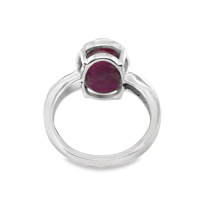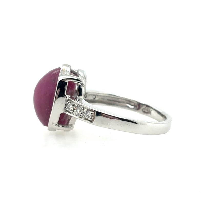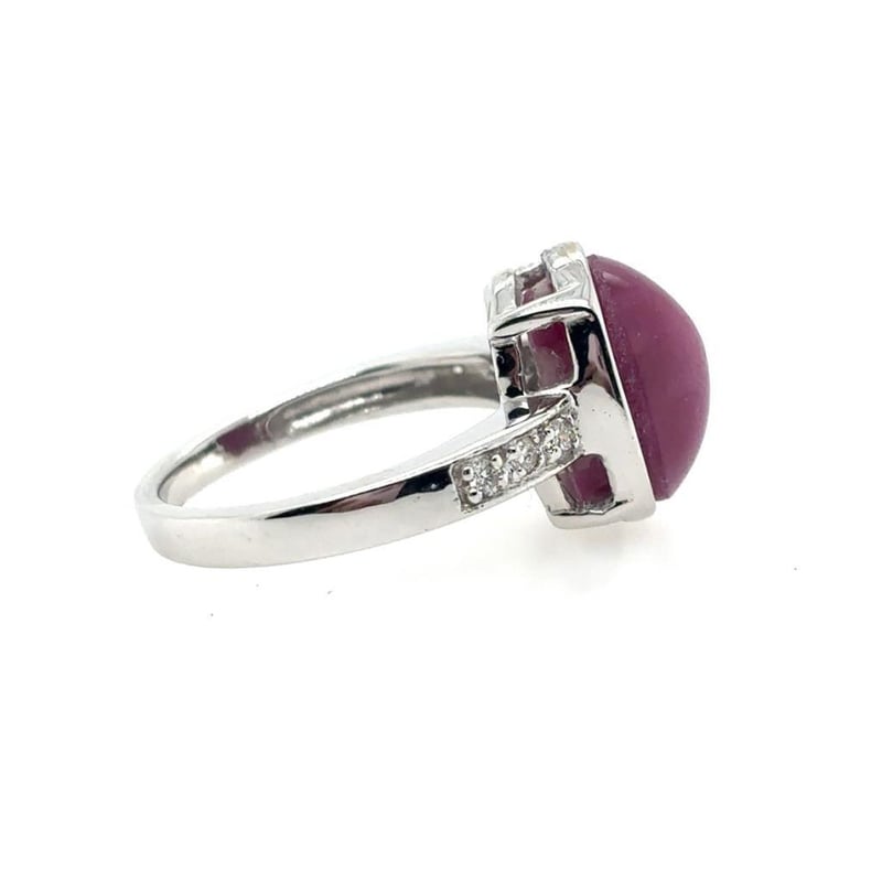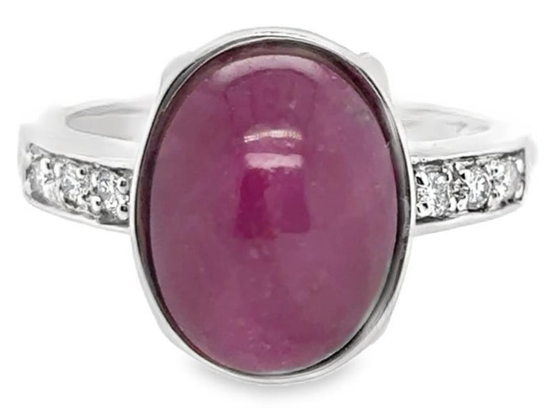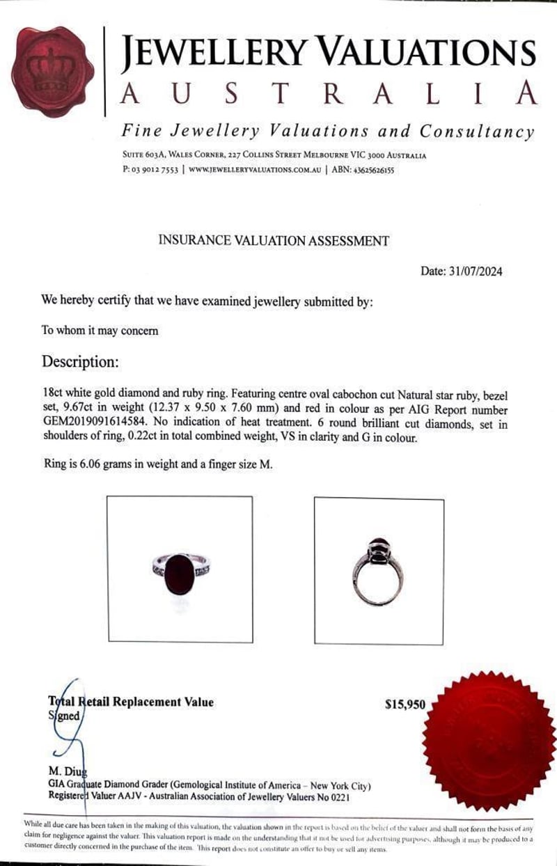 This 18Ct White Gold Rings Features 1 X 9.67Ct Oval Cabochon Cut Bezel Set Natural Star Ruby Measuring 12.37Mm X 9.50Mm X 7.60Mm And Is Red In Colour As Per Aig Report Number Gem2019091614584. There Are No Indications Of Heat Treatment. This Ring Also Features 6 X Round Brilliant Cut Diamonds Set In The Shoulders Of The Ring, 0.22Ct In Total Combined Weight, Vs In Clarity And G In Colour.