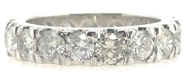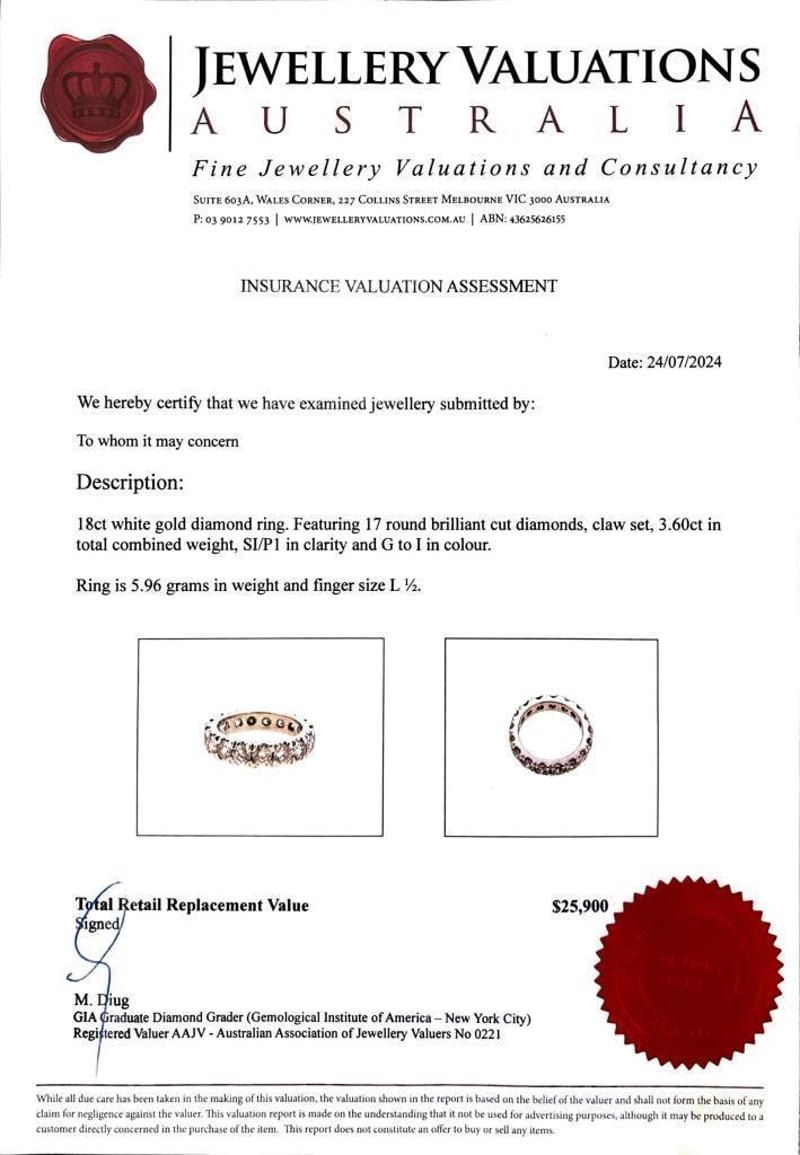 18K WHITE GOLD AND DIAMOND NEVER ENDING RING Total Item Weight: 5.96gms This 18K White Gold Ring Features 17 X Round Brilliant Cut Claw Set Diamonds, 3.60Ct In Total Combined Weight, Si-P1 In Clarity And G-I In Colour.Ring Size: L.5 Jewellery Valuations Provided By A Third Party Professional Not Directly Associated With Lloyds Auctions at AUD $25900This Insurance Valuation has been provided by a registered Jewellery Valuer and is intended for insurance purposes only. The valuation amount has no bearing on the auction value of the item. Any questions regarding the valuation should be directed to the issuing Valuer (refer to contact details on the certificate) as Lloyds have no association or relationship with the Valuer or the valuation amount contained within the valuation. Condition: Excellent- Refer Images 0162901+149CROSSDOCK