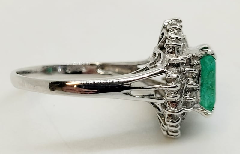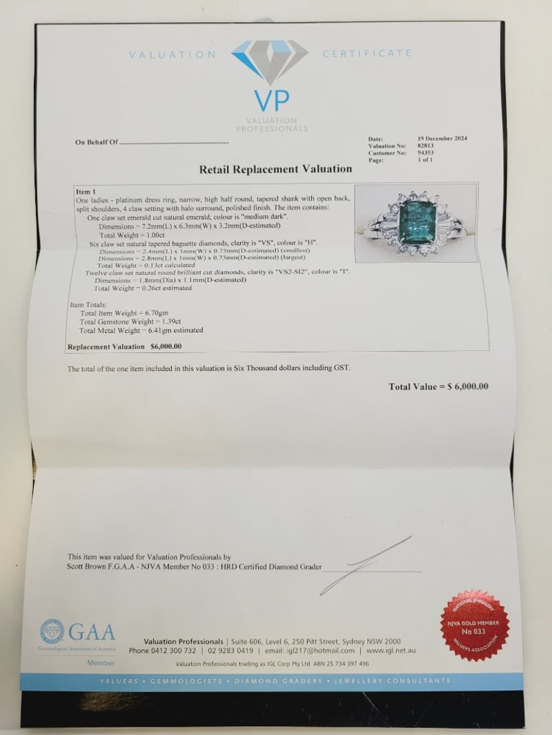 1.39CT EMERALD AND DIAMOND RING Item Totals - Total Item Weight: 6.70G Total Gemstone Weight: 1.39Ct Total Metal Weight: 6.41G Condition: Excellent - Refer To Images Provenance: Platinum Dress Ring, Narrow, High Half Round, Tapered Shank With Open Back, Split Shoulders, 4 Claw Setting With Halo Surround, Polished Finish. This valuation has been conducted by an independent third-party professional. The valuation amount is an assessment by the issuing valuer and does not reflect the auction value of the item. Any inquiries regarding the valuation should be directed to the issuing valuer (refer to contact details on the certificate), as Lloyds Auctions has no affiliation or influence over the valuation, the valuer, or the stated amount. Insurance Replacement Valuation Amount: $6,000.00 160466+38