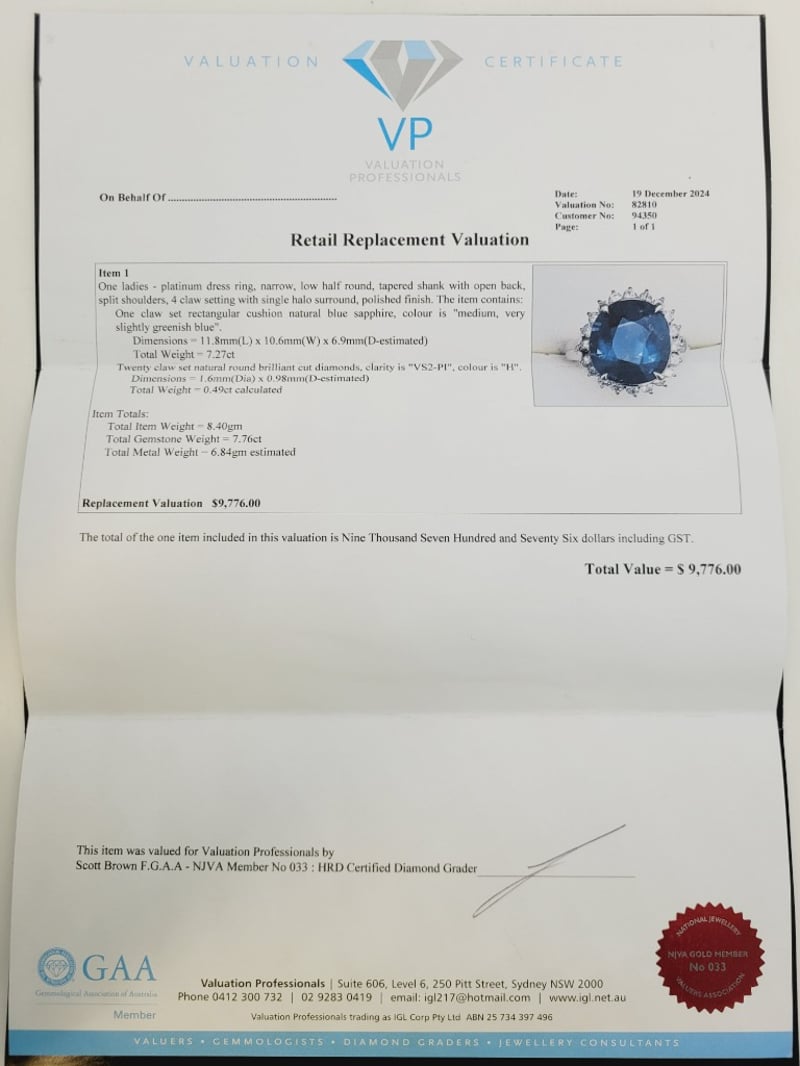 7.76CT BLUE SAPPHIRE AND DIAMOND RINGItem Totals - Total Items Weight: 8.40GTotal Gemstone Weight: 7.76CtTotal Metal Weight: 6.84G (Estimated)Condition: Excellent - Refer To ImagesProvenance: Platinum Dress Ring , Narrow, Low Half Round, Tapered Shank With Open Back, Split Shoulders, 4 Claw Setting With Single Halo Surround, Polished Finish.This valuation has been conducted by an independent third-party professional. The valuation amount is an assessment by the issuing valuer and does not reflect the auction value of the item.Any inquiries regarding the valuation should be directed to the issuing valuer (refer to contact details on the certificate), as Lloyds Auctions has no affiliation or influence over the valuation, the valuer, or the stated amount.Insurance Replacement Valuation Amount: $9,776.00160466+45