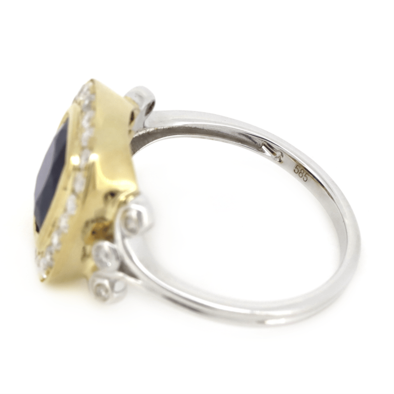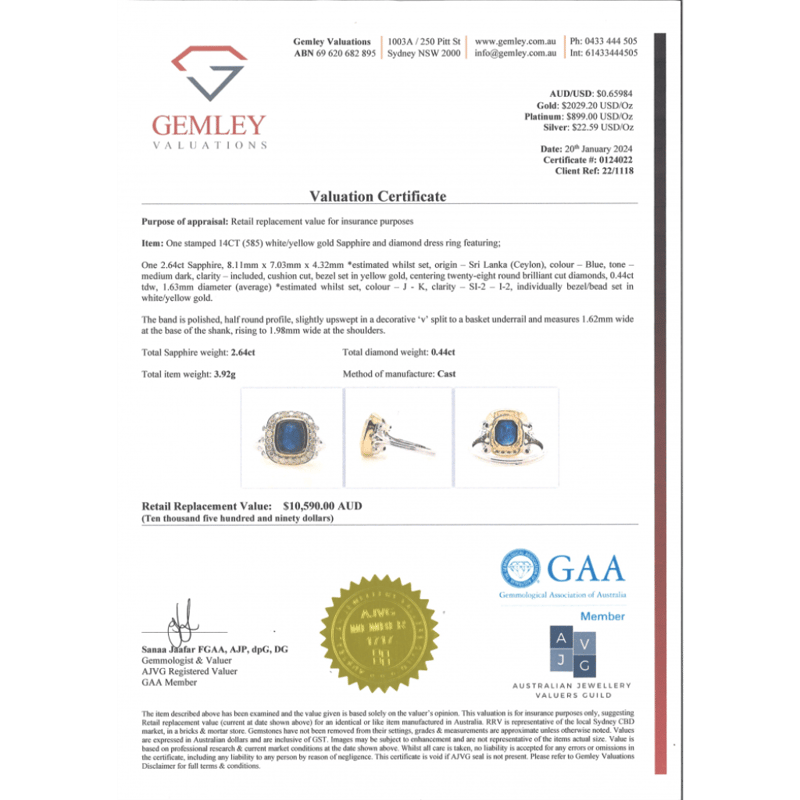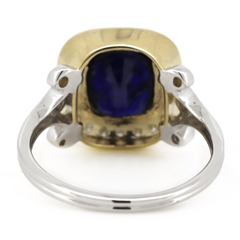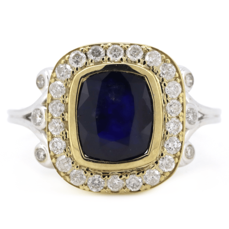 14K YELLOW/WHITE GOLD, 2.64CT BLUE CEYLON SAPPHIRE AND DIAMOND, DRESS RING. THE CENTRE FEATURES, ONE CUSHION CUT, MEDIUM DARK BLUE, CEYLON SAPPHIRE (2.64CT, INCLUDED), BEZEL SET IN YELLOW GOLD. SURROUNDING THE CENTRE AND DECORATING THE SHOULDERS ARE, 28 ROUND BRILLIANT CUT, DIAMONDS (0.44CT TDW, J-K COLOUR, SI2-I2 CLARITY), BEZEL/BEAD SET IN WHITE/YELLOW GOLD. RING SIZE N.