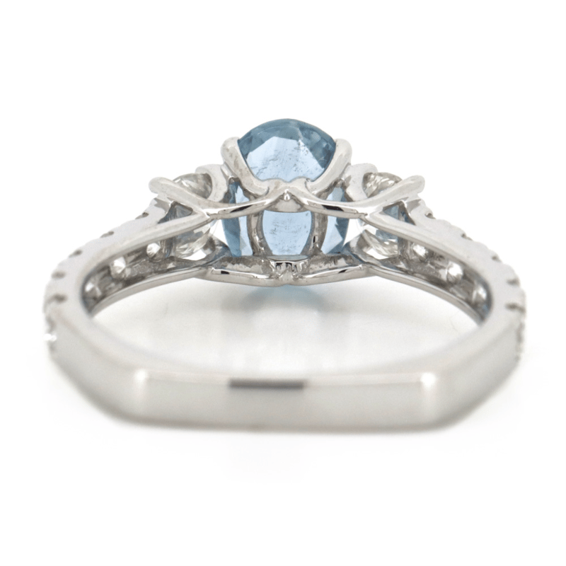 14K WHITE GOLD, AQUAMARINE AND DIAMOND, DRESS RING. THE CENTRE FEATURES, ONE OVAL CUT, AQUAMARINE (0.89CT, STRONG LIGHT BLUE), CLAW SET. DECORATING THE SHOULDERS ARE, 2 ROUND BRILLIANT CUT, DIAMONDS (0.42CT TDW, G-H COLOUR, SI1-SI2 CLARITY). EMBELLISHING THE BAND ARE, 10 ROUND BRILLIANT CUT, DIAMONDS (0.51CT TDW, G-H COLOUR, SI1-SI2 CLARITY), CLAW SET. RING SIZE M 1/2.