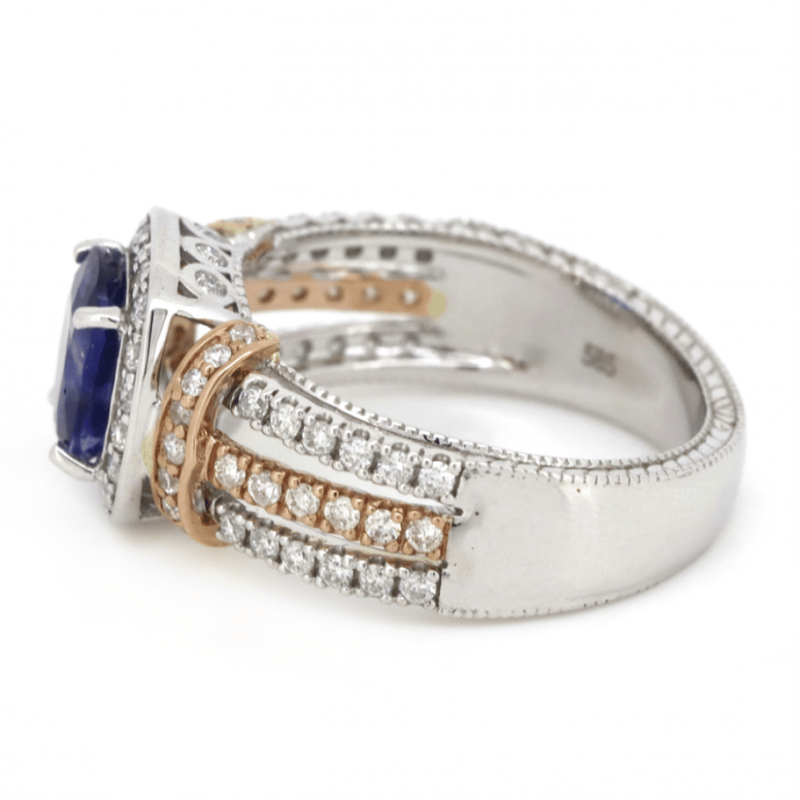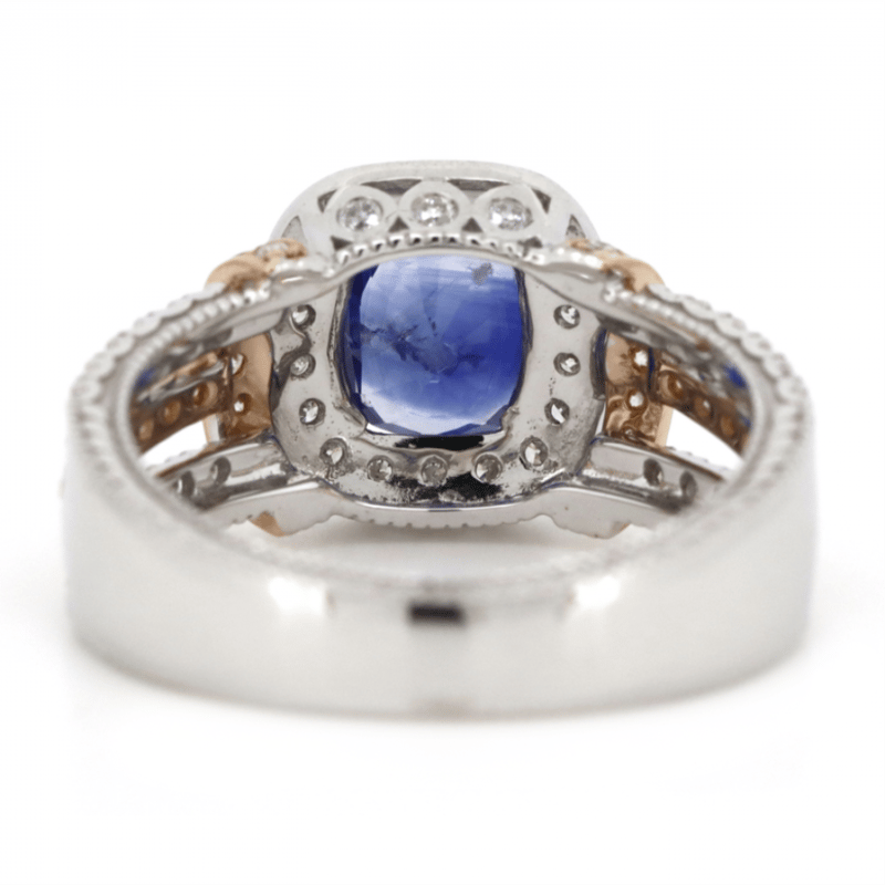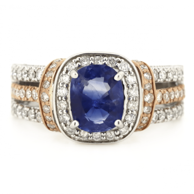 14K WHITE/ROSE GOLD, 1.52CT BLUE CEYLON SAPPHIRE AND DIAMOND, DRESS RING. THE CENTRE FEATURES, ONE CUSHION CUT, MEDIUM BLUE, SAPPHIRE (1.52CT, MINOR EYE VISIBLE INCLUSIONS), 4 CLAW SET. SURROUNDING THE CENTRE AND DECORATING THE MULTI-ROW SPLIT BAND ARE, 78 ROUND BRILLIANT CUT, DIAMONDS, (0.64CT TDW, H-J COLOUR, SI2-I1 CLARITY), BEZEL/MICRO CLAW SET IN ROSE/WHITE GOLD. RING SIZE M 1/2.