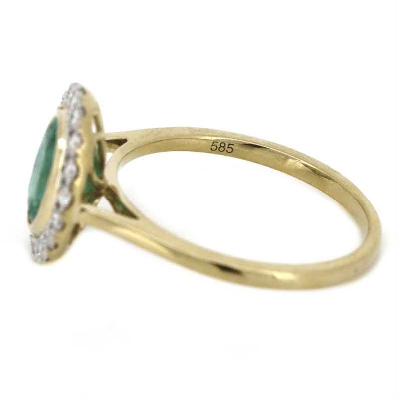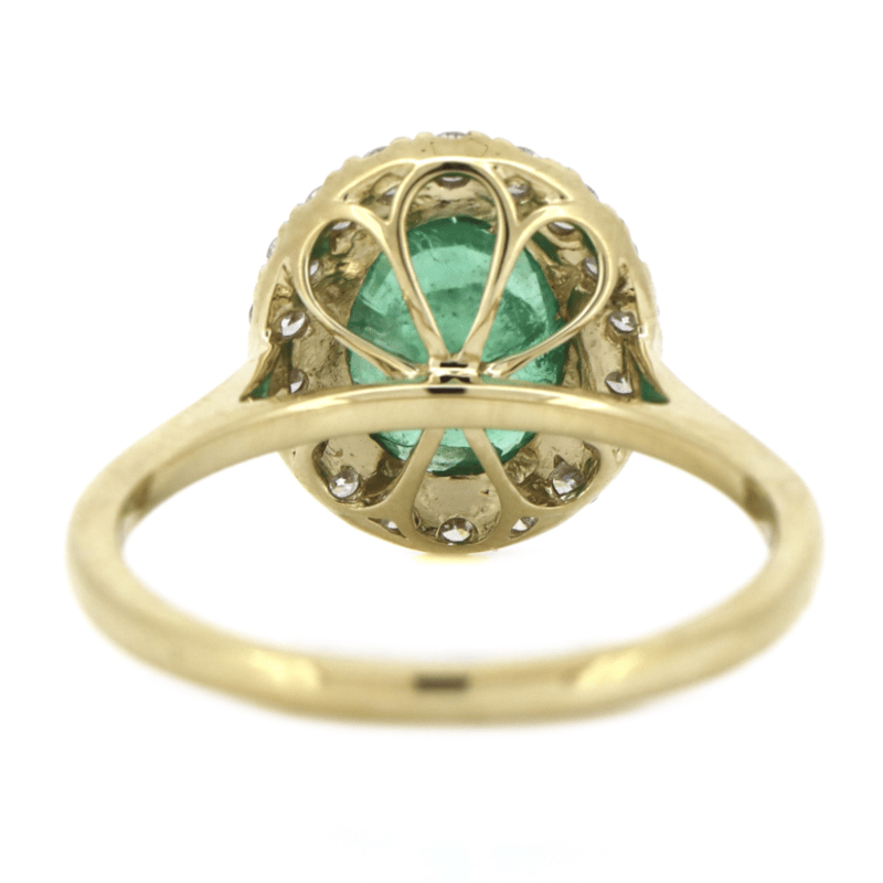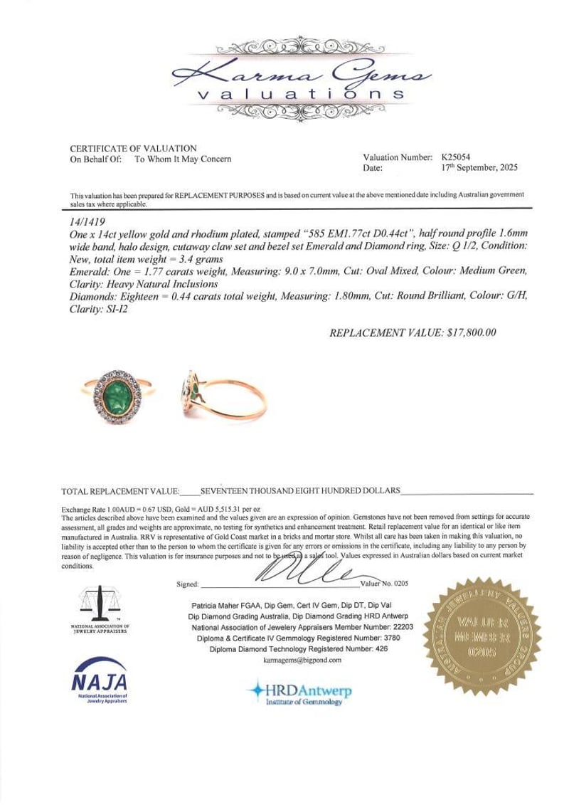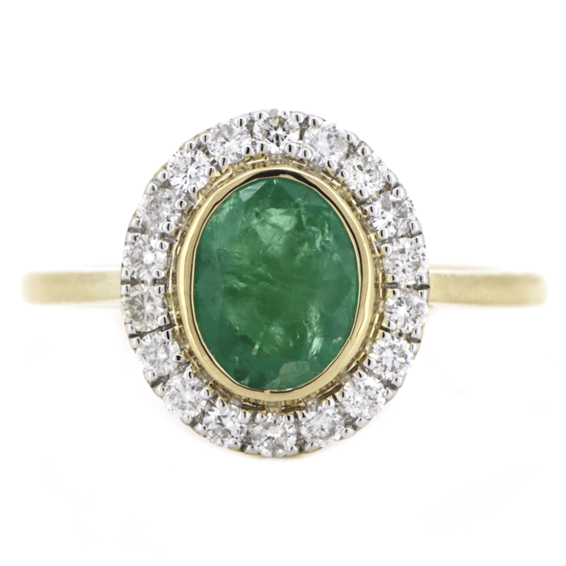 14K YELLOW GOLD, EMERALD AND DIAMOND, HALO RING. THE CENTRE FEATURES, ONE OVAL CUT, MEDIUM GREEN, EMERALD (1.77CT, HEAVY INCLUSIONS), BEZEL SET. SURROUNDING THE CENTRE IN A HALO ARE, 18 ROUND BRILLIANT CUT, DIAMONDS (0.44CT TDW, G-H COLOUR, SI-I2 CLARITY), CUTAWAY CLAW SET. RING SIZE Q 1/2.