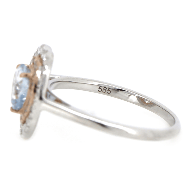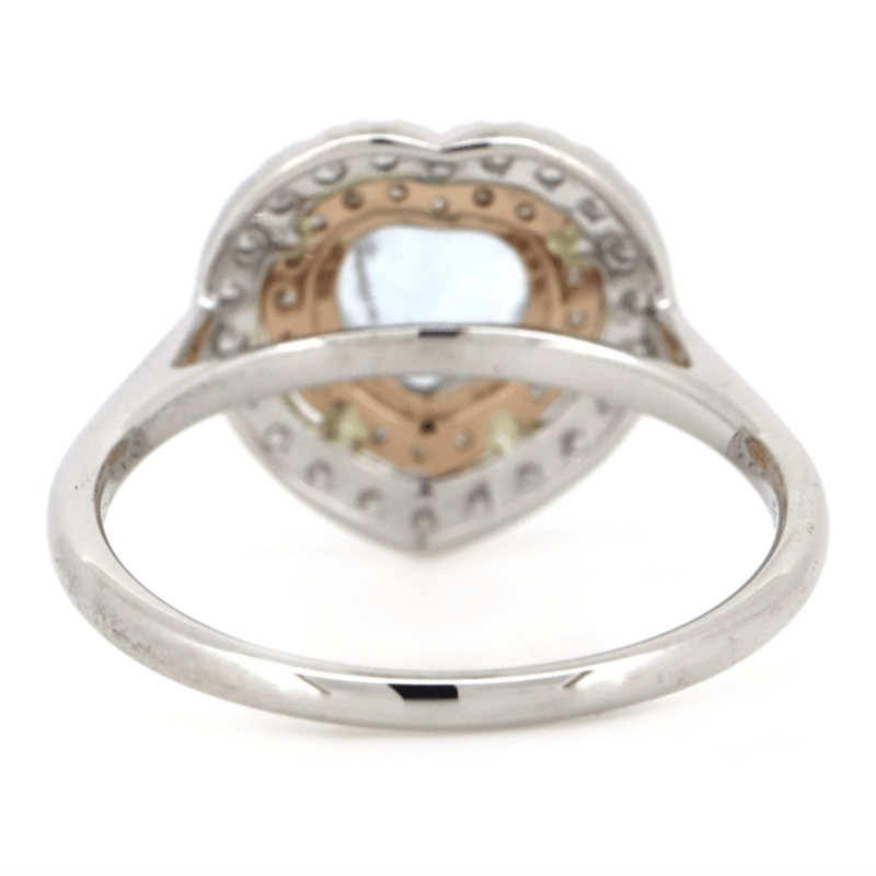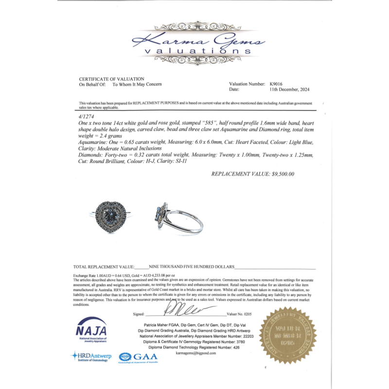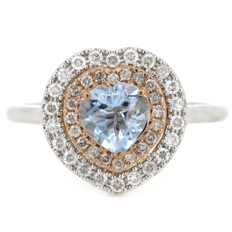 14K WHITE/ROSE GOLD, AQUAMARINE AND DIAMOND, DOUBLE HALO RING. THE CENTRE FEATURES, ONE HEART FACETED CUT, LIGHT BLUE, AQUAMARINE (0.65CT, MODERATE NATURAL INCLUSIONS), 3 CLAW SET IN ROSE GOLD. DECORATING THE INNERMOST HALO ARE, 20 ROUND BRILLIANT CUT, DIAMONDS (0.10CT TDW, H-J COLOUR, SI-I1 CLARITY), BEAD SET IN ROSE GOLD. DECORATING THE OUTERMOST HALO ARE, 22 ROUND BRILLIANT CUT, DIAMONDS (0.22CT TDW, H-J COLOUR, SI-I1 CLARITY), BEAD SET. RING SIZE M. Valuations Provided by an Independent Third-Party Professional Not Directly Associated With Lloyds Auctions at AUD $$9,500.00This valuation has been conducted by an independent third-party professional. The valuation amount is an assessment by the issuing valuer and does not reflect the auction value of the item. Any inquiries regarding the valuation should be directed to the issuing valuer (refer to contact details on the certificate), as Lloyds Auctions has no affiliation or influence over the valuation, the valuer, or the stated amount. Condition: Good - Refer Images 0645862+313