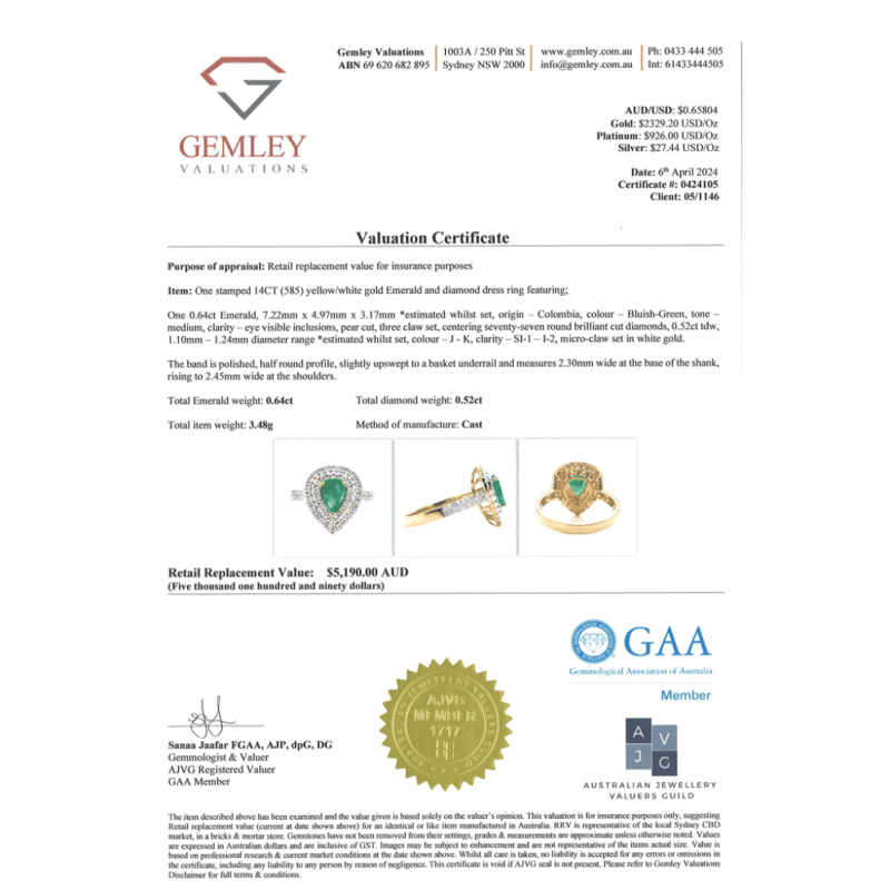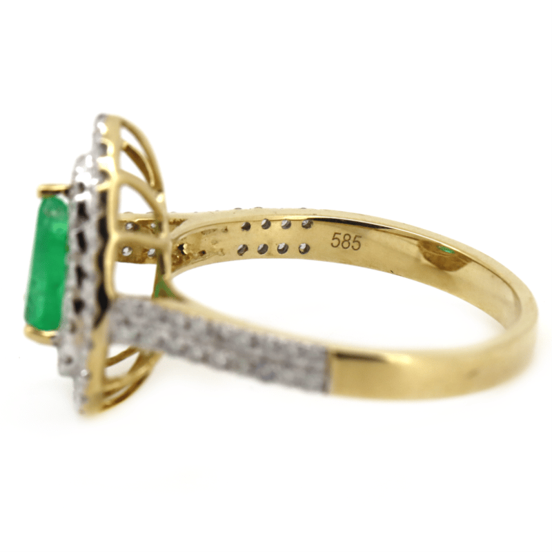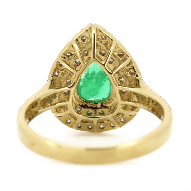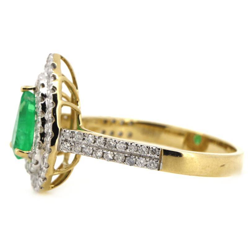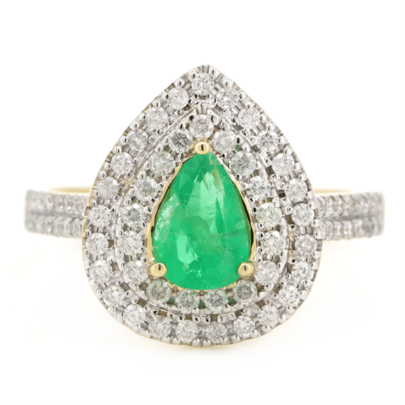 14K YELLOW/WHITE GOLD, 0.64CT COLOMBIAN EMERALD AND DIAMOND, DOUBLE HALO RING. THE CENTRE FEATURES, ONE PEAR CUT, MEDIUM BLUISH-GREEN, COLOMBIAN EMERALD (0.64CT, EYE VISIBLE INCLUSIONS), 3 CLAW SET. SURROUNDING THE CENTRE IN A DOUBLE HALO AND DECORATING THE BAND ARE, 77 ROUND BRILLIANT CUT, DIAMONDS (0.52CT TDW, J-K COLOUR, SI1-I2 CLARITY), MICRO-CLAW SET IN WHITE GOLD. RING SIZE M.