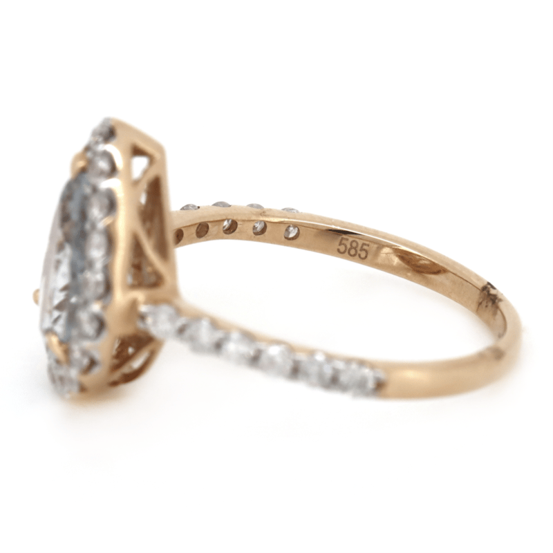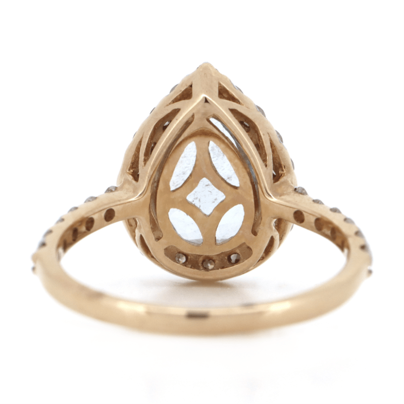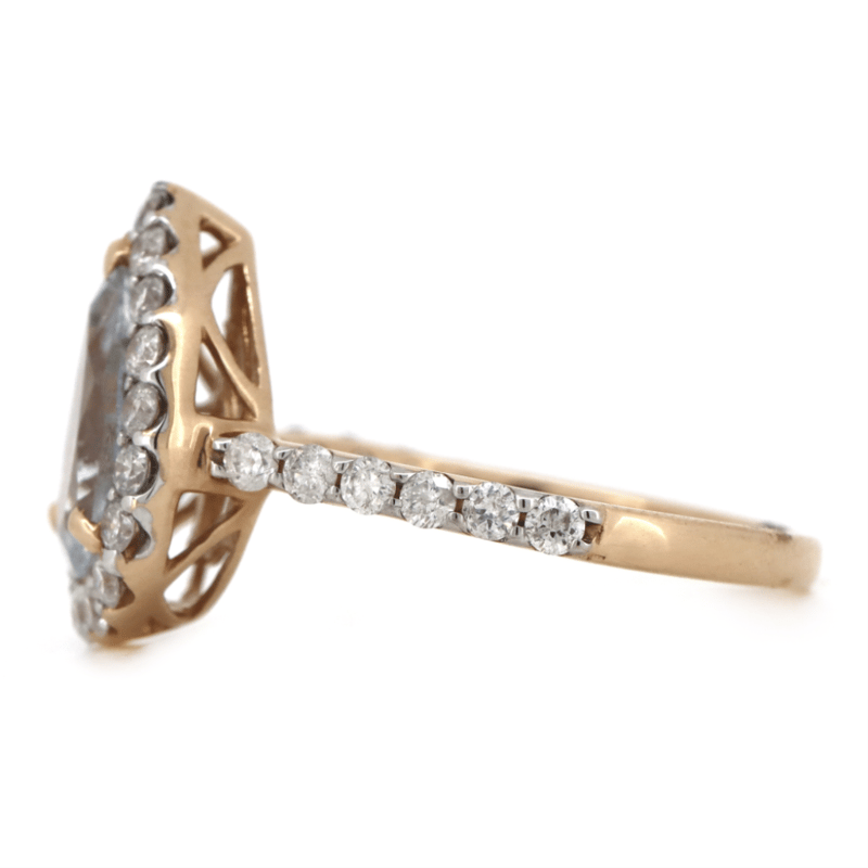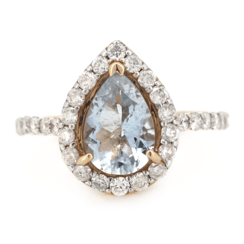 14K ROSE GOLD, AQUAMARINE AND DIAMOND, HALO RING. THE CENTRE FEATURES, ONE PEAR CUT, LIGHT GREYISH-BLUE, AQUAMARINE (1.04CT, MINOR EYE VISIBLE INCLUSIONS), 3 CLAW SET. SURROUNDING THE CENTRE IN A HALO AND DECORATING THE BAND ARE, 30 ROUND BRILLIANT CUT, DIAMONDS (0.55CT TDW, J-K COLOUR, SI2-I2 CLARITY), BEAD SET. RING SIZE K.