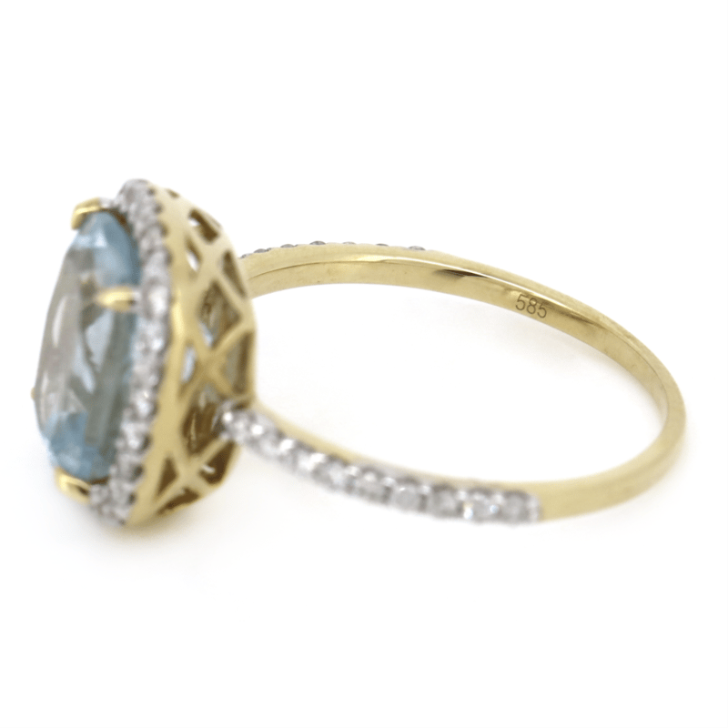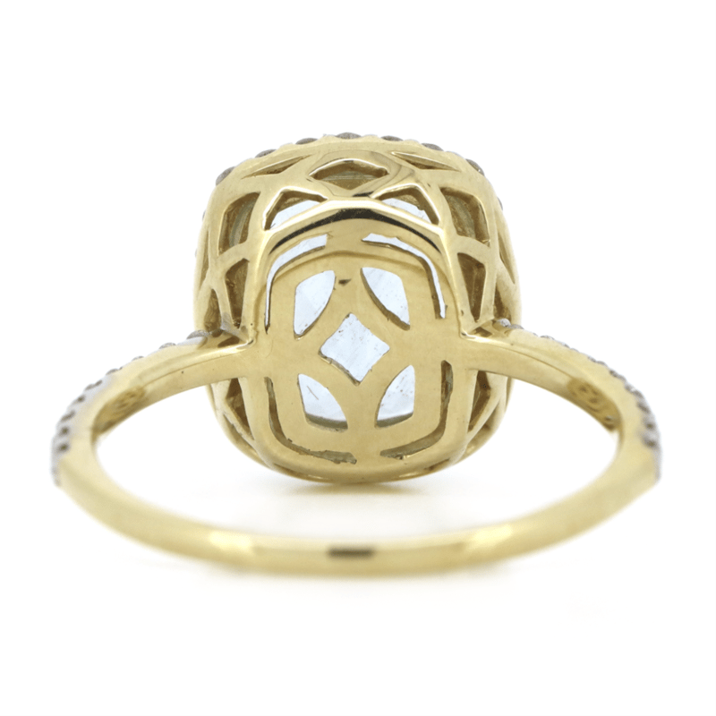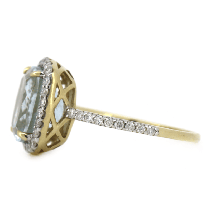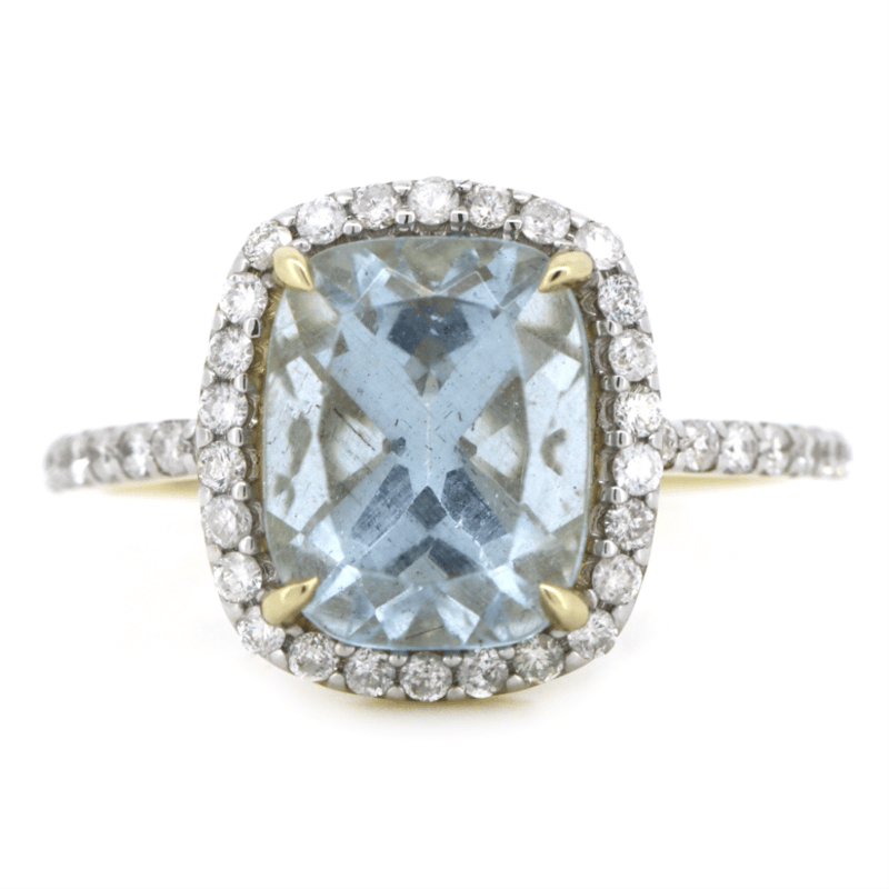 14K YELLOW GOLD, AQUAMARINE AND DIAMOND, HALO RING. THE CENTRE FEATURES, ONE RECTANGULAR CUSHION CUT, MEDIUM BLUE, AQUAMARINE (2.85CT, SLIGHTLY INCLUDED), 4 CLAW SET. SURROUNDING THE CENTRE IN A HALO AND DECORATING THE BAND ARE, 42 ROUND BRILLIANT CUT, DIAMONDS (0.40CT TDW, I-K COLOUR, SI2-P2 CLARITY), MICRO-CLAW SET IN WHITE GOLD. RING SIZE N. Valuations Provided by an Independent Third-Party Professional Not Directly Associated With Lloyds Auctions at AUD $$7,850.00This valuation has been conducted by an independent third-party professional. The valuation amount is an assessment by the issuing valuer and does not reflect the auction value of the item. Any inquiries regarding the valuation should be directed to the issuing valuer (refer to contact details on the certificate), as Lloyds Auctions has no affiliation or influence over the valuation, the valuer, or the stated amount. Condition: Good - Refer Images 0645862+373