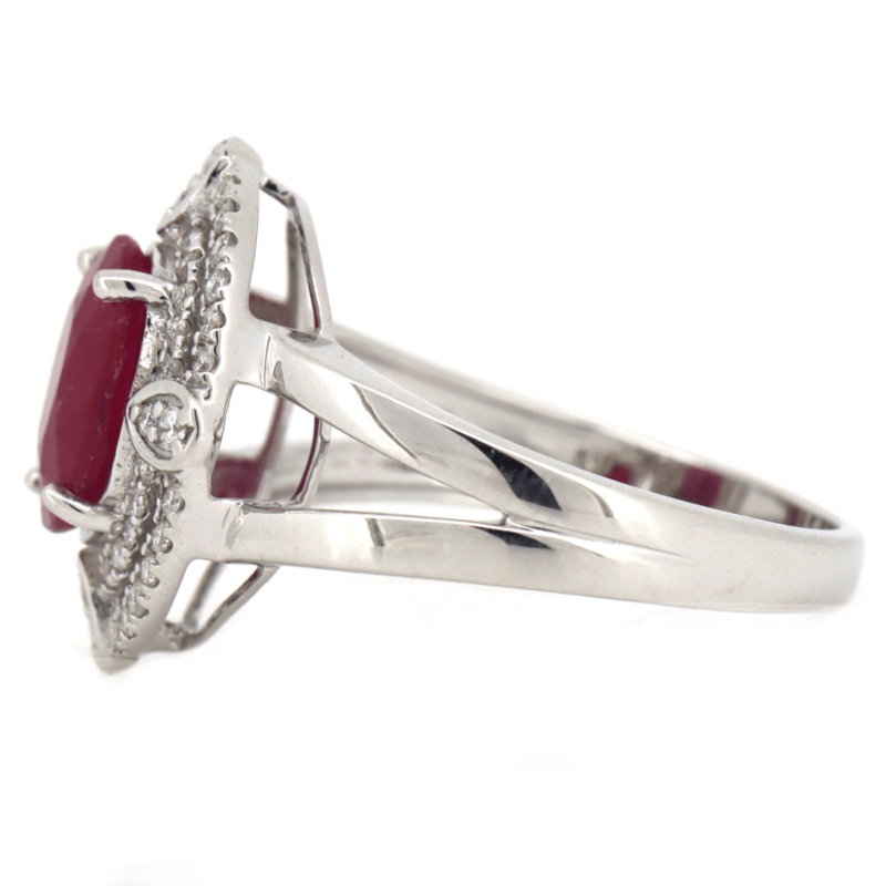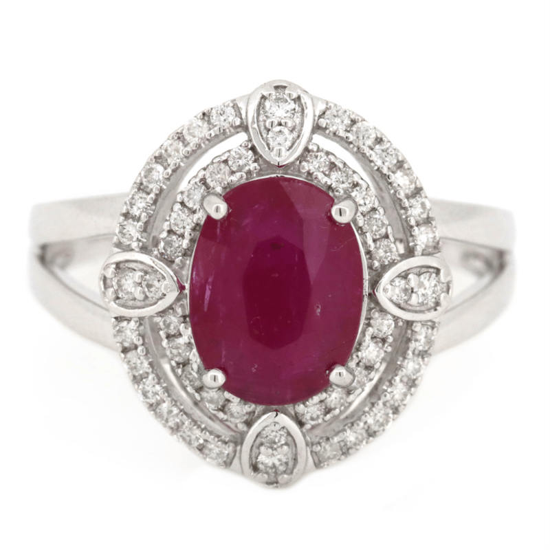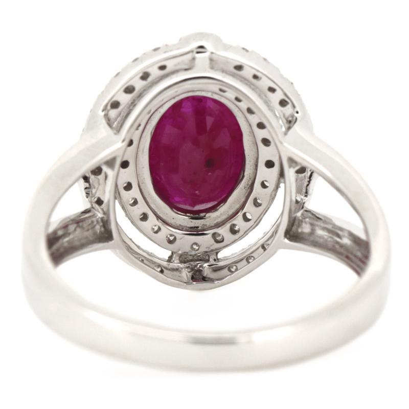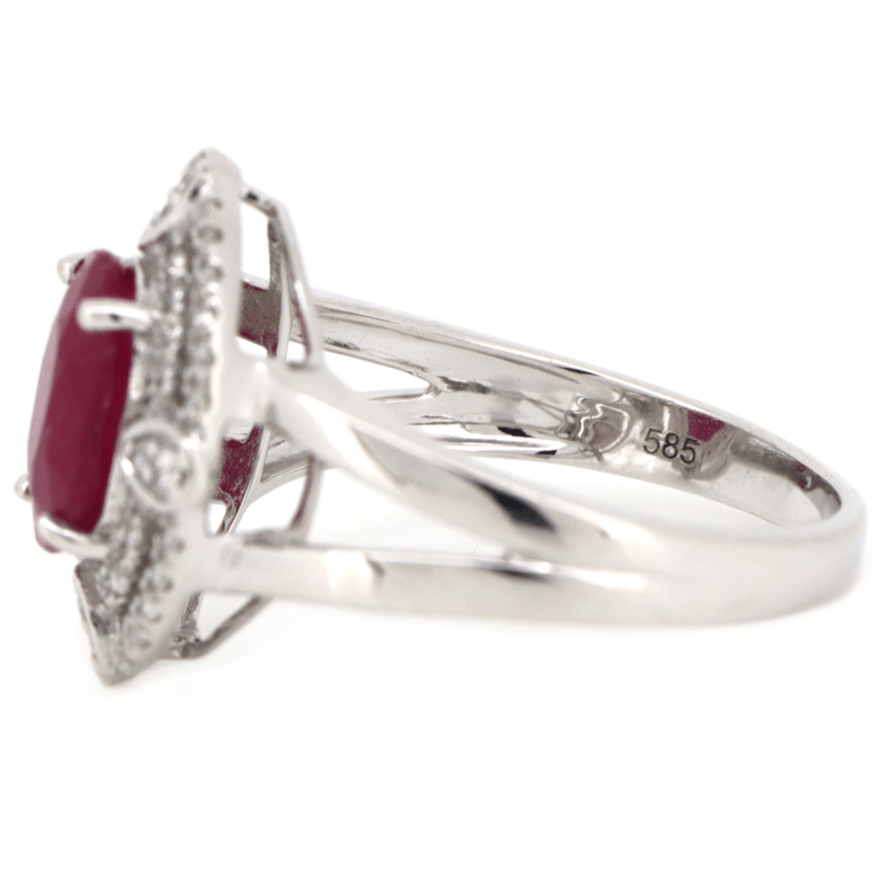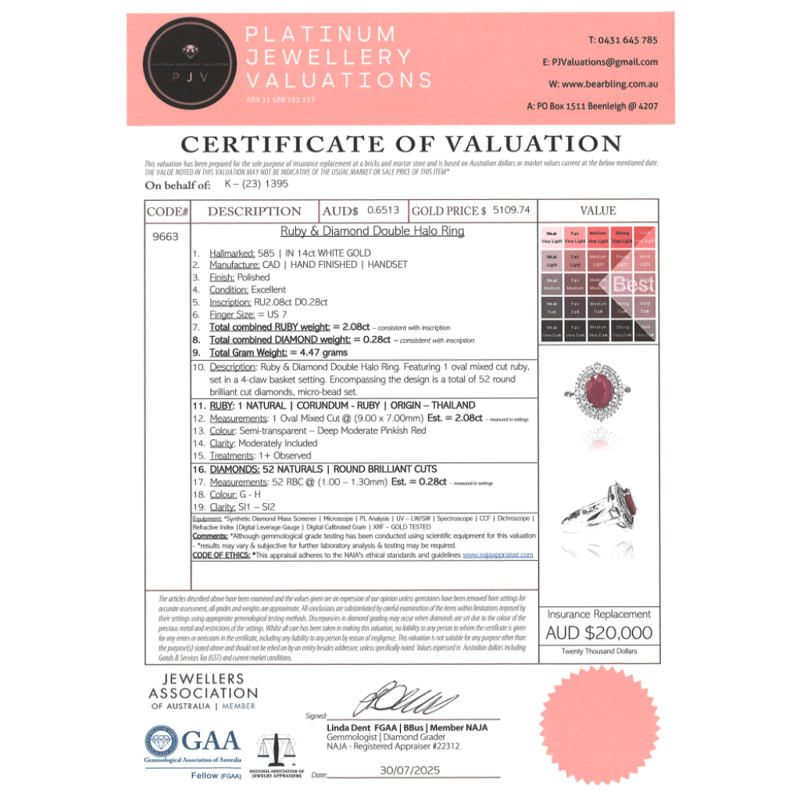 14K WHITE GOLD, RUBY AND DIAMOND, DOUBLE HALO RING. THE CENTRE FEATURES, ONE OVAL CUT, RUBY (2.08CT, MODERATE INCLUSIONS), 4 CLAW SET. ENCOMPASSING THE DESIGN ARE, 52 ROUND BRILLIANT CUT, DIAMONDS (0.28CT TDW, G-H COLOUR, SI1-SI2 CLARITY), MICRO-BEAD SET. RING SIZE N 1/2. Valuations Provided by an Independent Third-Party Professional Not Directly Associated With Lloyds Auctions at AUD $$20,000.00This valuation has been conducted by an independent third-party professional. The valuation amount is an assessment by the issuing valuer and does not reflect the auction value of the item. Any inquiries regarding the valuation should be directed to the issuing valuer (refer to contact details on the certificate), as Lloyds Auctions has no affiliation or influence over the valuation, the valuer, or the stated amount. Condition: Good - Refer Images 0645862+389