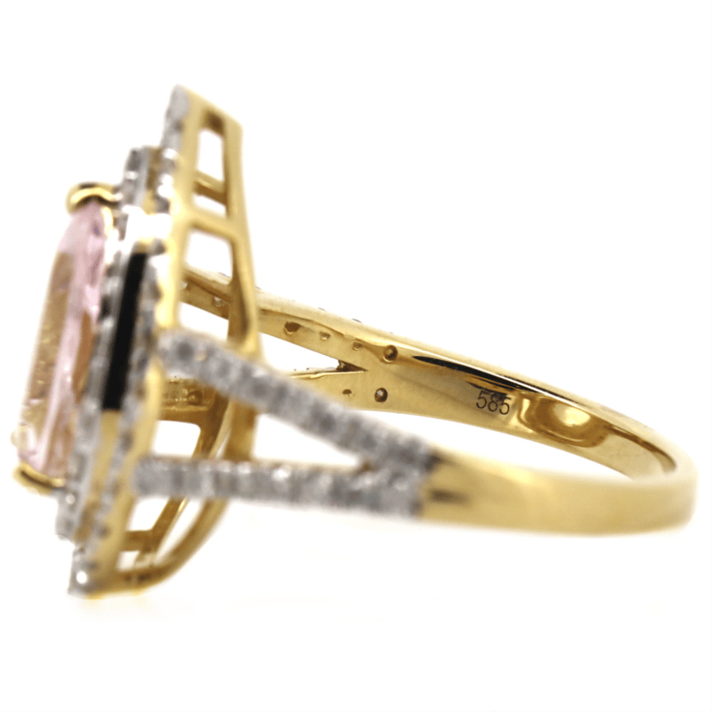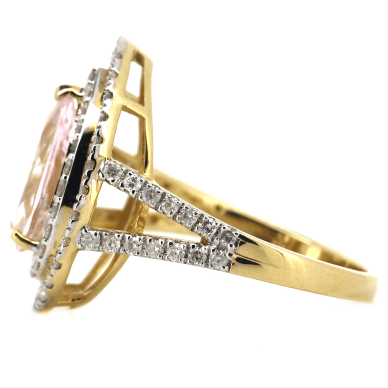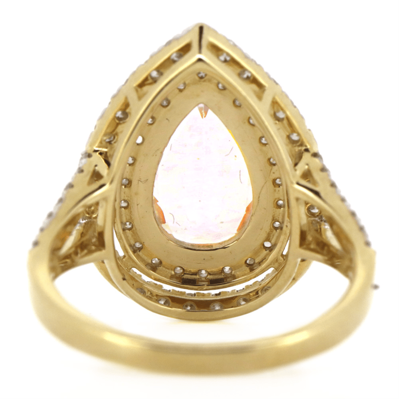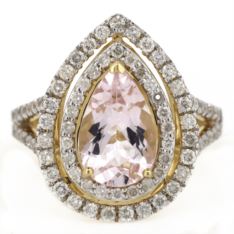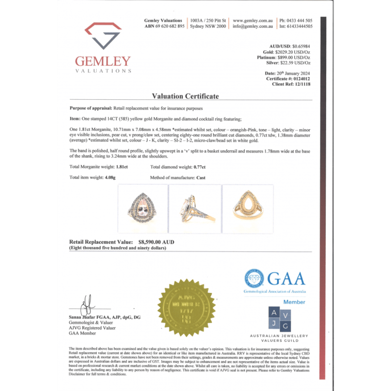 14K YELLOW GOLD, MORGANITE AND DIAMOND, DOUBLE HALO STATEMENT RING. THE CENTRE FEATURES, ONE PEAR CUT, ORANGISH-PINK, MORGANITE (1.81CT, MINOR EYE VISIBLE INCLUSIONS), CLAW SET. SURROUNDING THE CENTRE IN A DOUBLE HALO AND DECORATING THE BAND ARE, 81 ROUND BRILLIANT CUT, DIAMONDS (0.77CT TDW, J-K COLOUR, SI2-I2 CLARITY), MICRO CLAW/BEAD SET IN WHITE GOLD. RING SIZE M 1/2. Valuations Provided by an Independent Third-Party Professional Not Directly Associated With Lloyds Auctions at AUD $$8,590.00This valuation has been conducted by an independent third-party professional. The valuation amount is an assessment by the issuing valuer and does not reflect the auction value of the item. Any inquiries regarding the valuation should be directed to the issuing valuer (refer to contact details on the certificate), as Lloyds Auctions has no affiliation or influence over the valuation, the valuer, or the stated amount. Condition: Good - Refer Images 0645862+339