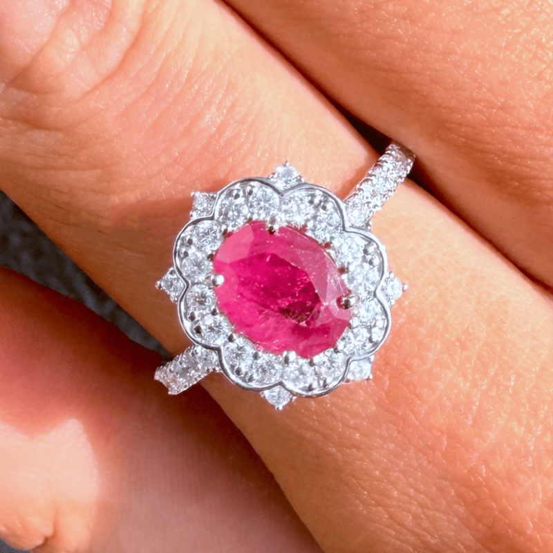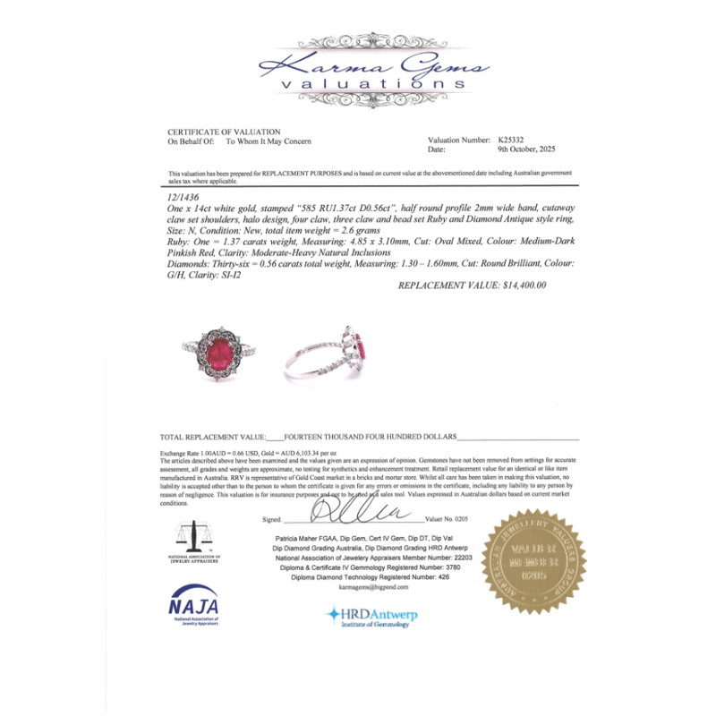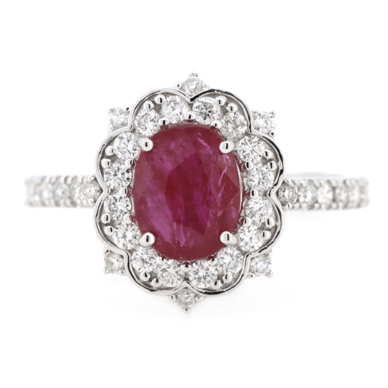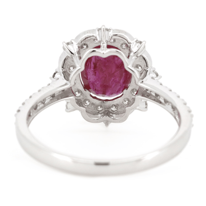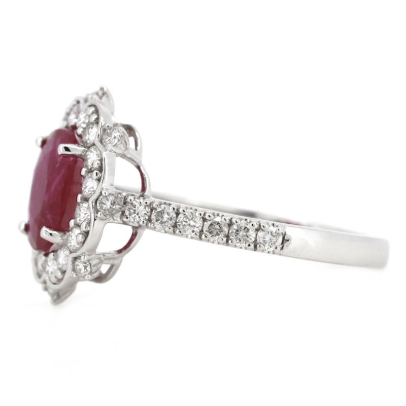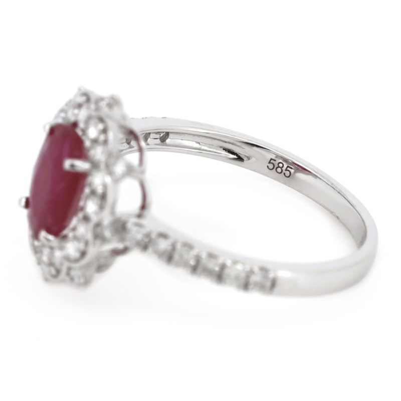 14K WHITE GOLD, RUBY AND DIAMOND, DRESS RING. THE CENTRE FEATURES, ONE OVAL CUT, MEDIUM-DARK PINKISH-RED, RUBY (1.37CT, MODERATE-HEAVY INCLUSIONS), CLAW SET. DECORATING THE HALO AND THE BAND ARE, 36 ROUND BRILLIANT CUT, DIAMONDS (0.56CT TDW, G-H COLOUR, SI-I2 CLARITY), BEAD SET. RING SIZE N.