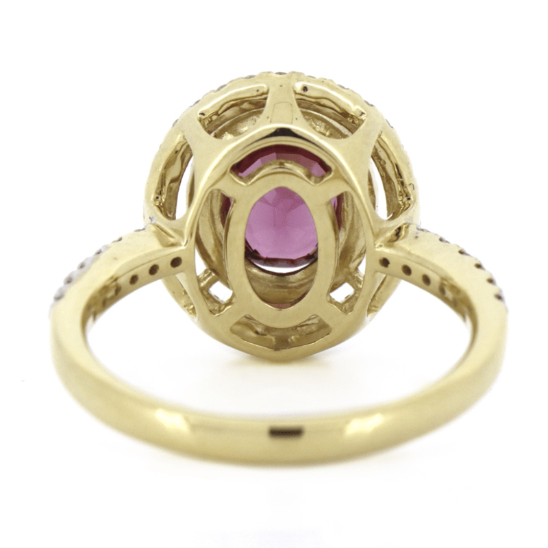 14K YELLOW GOLD, RHODOLITE GARNET AND DIAMOND, DOUBLE HALO RING. THE CENTRE FEATURES, ONE OVAL CUT, PINKISH-PURPLE, RHODOLITE GARNET (1.38CT, EYE CLEAN CLARITY), 4 CLAW SET. SURROUNDING THE CENTRE IN A DOUBLE HALO AND DECORATING THE BAND ARE, 62 ROUND BRILLIANT CUT, DIAMONDS (0.49CT TDW, H-I COLOUR, SI-I2 CLARITY), MICRO-CLAW SET IN YELLOW GOLD. RING SIZE M.