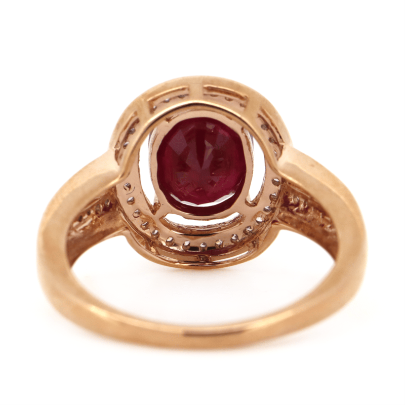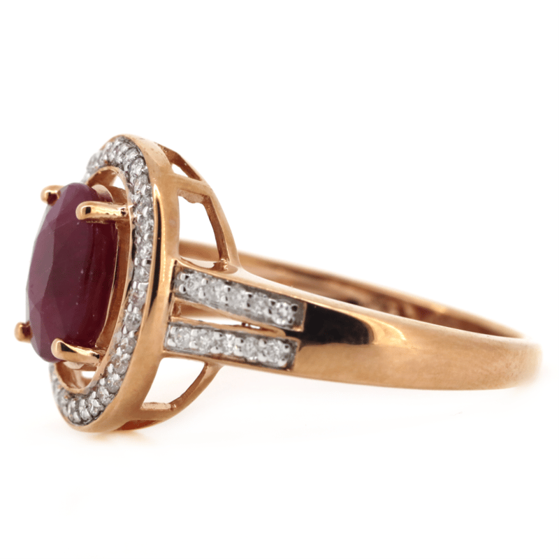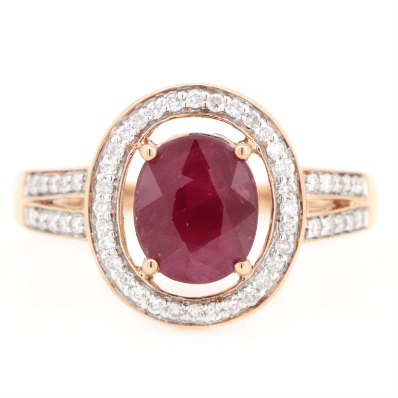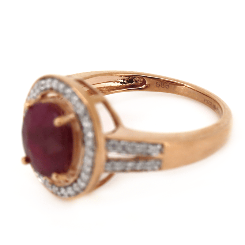 14K ROSE GOLD, RUBY AND DIAMOND, HALO SPLIT BAND RING. THE CENTRE FEATURES, ONE OVAL CUT, MEDIUM DARK PURPLISH-RED, RUBY (2.38CT, INCLUDED), 4 CLAW SET. SURROUNDING THE CENTRE IN A HALO AND DECORATING THE BAND ARE, 52 ROUND BRILLIANT CUT, DIAMONDS (0.27CT TDW, J-K COLOUR, SI2-I2 CLARITY), BEAD SET. RING SIZE N 1/2.