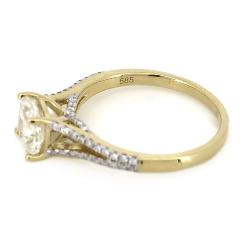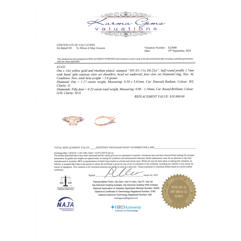 14K YELLOW GOLD AND DIAMOND, CLASSIC SPLIT BAND RING. THE CENTRE FEATURES, ONE EMERALD RADIANT CUT, DIAMOND (1.17CT, H-I COLOUR, I1 CLARITY), 4 CLAW SET. DECORATING THE SPLIT BAND AND UNDER RAIL AND ARE, 54 ROUND BRILLIANT CUT, DIAMONDS (0.22CT TDW, G-H COLOUR, SI-I1 CLARITY), CLAW SET. RING SIZE M. Valuations Provided by an Independent Third-Party Professional Not Directly Associated With Lloyds Auctions at AUD $$18,800.00This valuation has been conducted by an independent third-party professional. The valuation amount is an assessment by the issuing valuer and does not reflect the auction value of the item. Any inquiries regarding the valuation should be directed to the issuing valuer (refer to contact details on the certificate), as Lloyds Auctions has no affiliation or influence over the valuation, the valuer, or the stated amount. Condition: Good - Refer Images 0645862+368